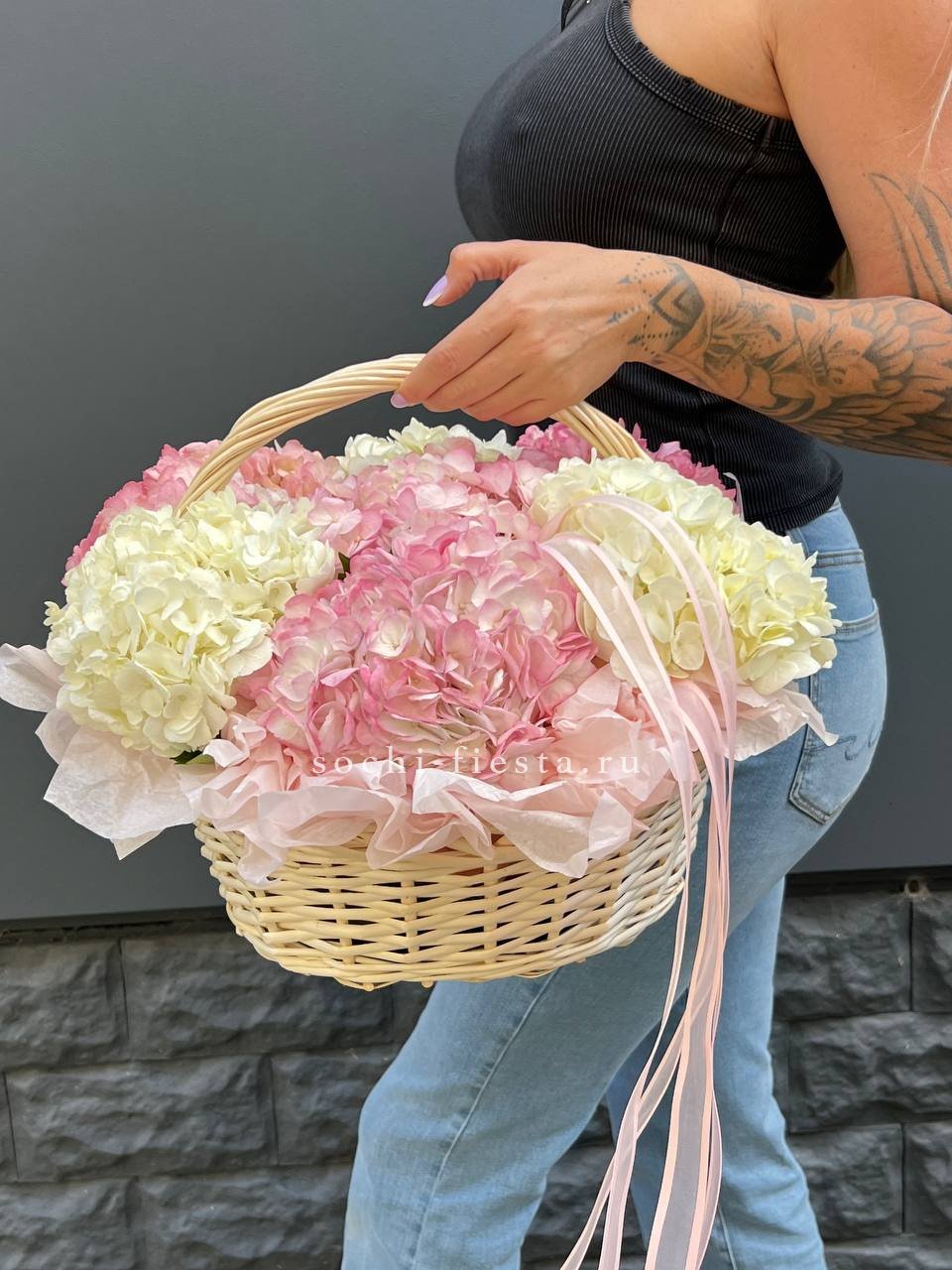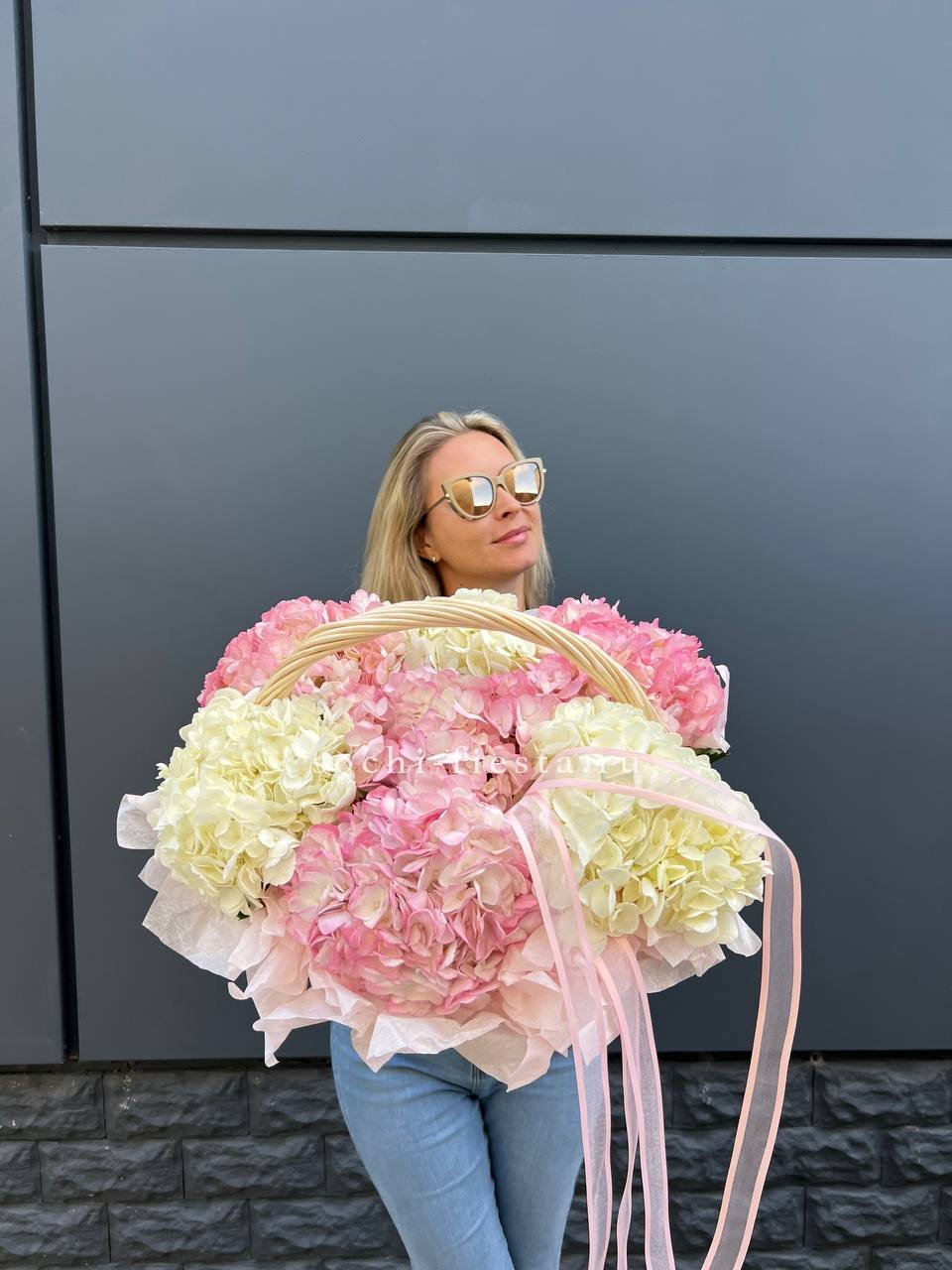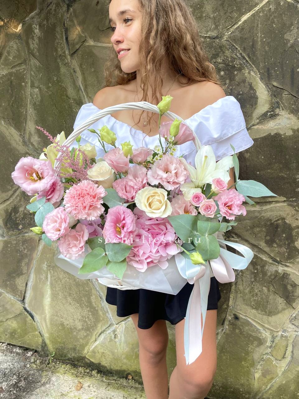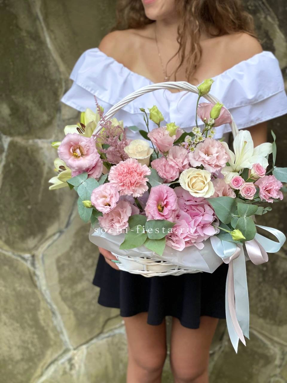 Воздушные соцветия эустомы собраны в округлую композицию с мягким переходом пастельных тонов. Светлая корзина создает легкую базу для объемной цветочной шапки.