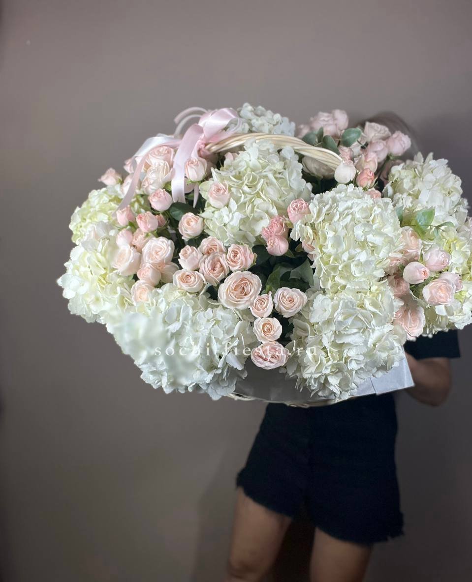 Пышная композиция в плетеной корзине объединяет розы, гортензию, эустому и дельфиниум в единую объемную форму. Маттиола и бомбастик добавляют воздушности, а эвкалипт создает мягкий природный фон. Корзина удобно располагается на любой поверхности и держит форму без дополнительной опоры.