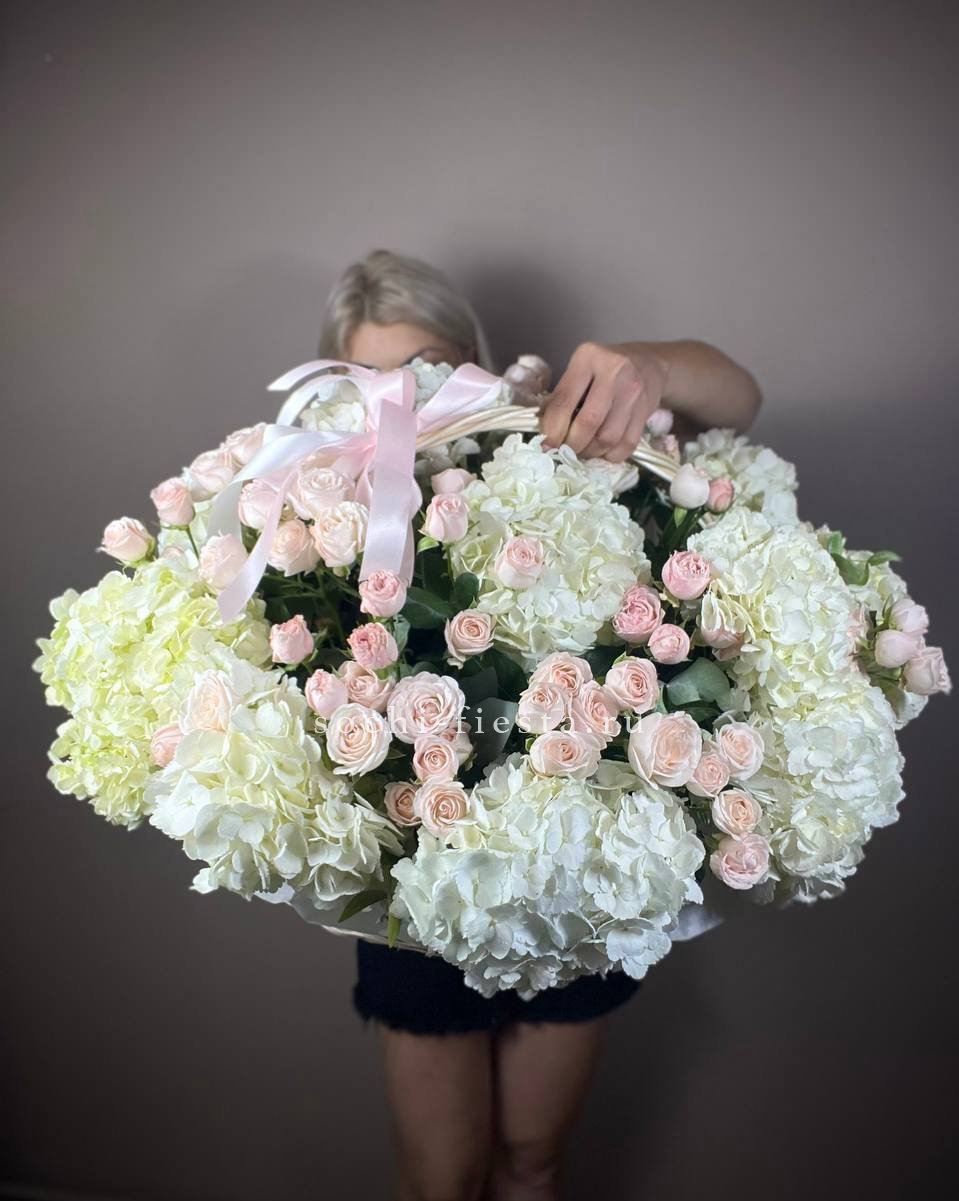 гортензия, бомбастик, эустома, розы одноголовые, дельфиниум (аналог вне сезона), маттиола, эвкалипт, лента, корзина D38.