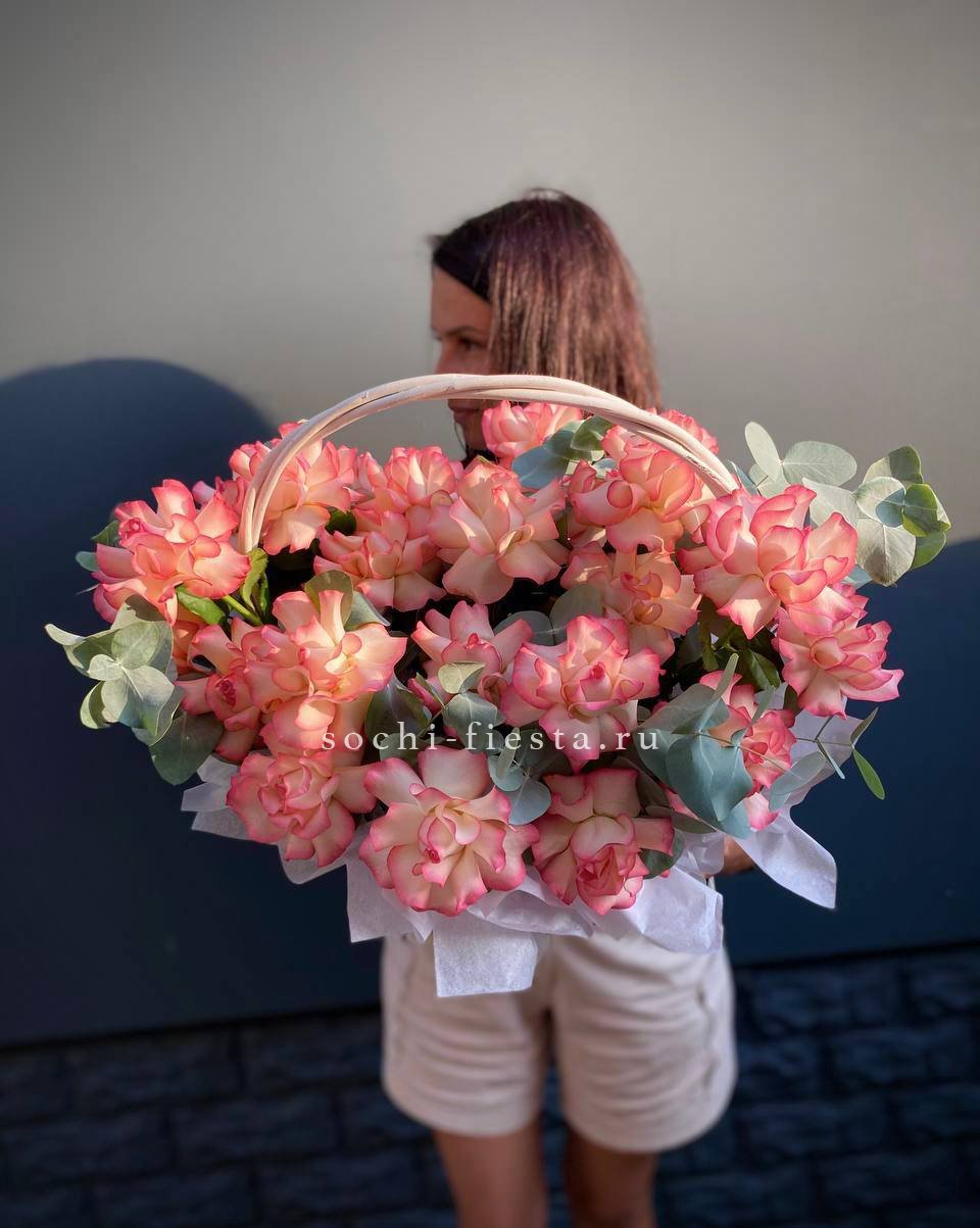 Пионовидные кустовые розы Джульетта с их густомахровыми бутонами создают объемную текстуру. Каждый цветок раскрывается слоями, формируя плотную и выразительную композицию в джутовом кашпо.