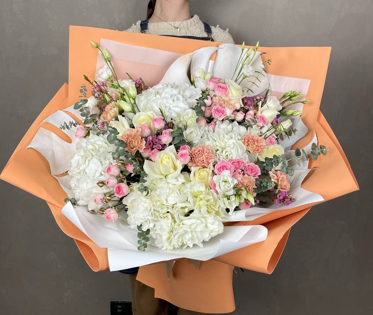 Объемная авторская работа с пионовидными розами и гортензией в пастельной гамме. Листья монстеры и эвкалипт добавляют графику, хамелациум создает дымку вокруг крупных бутонов.