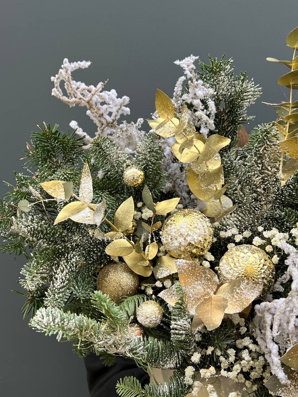 датский нобилис и ель образуют основу праздничной композиции в кашпо. Свеча и ёлочные игрушки дополняют образ, создавая готовое решение для новогоднего интерьера.