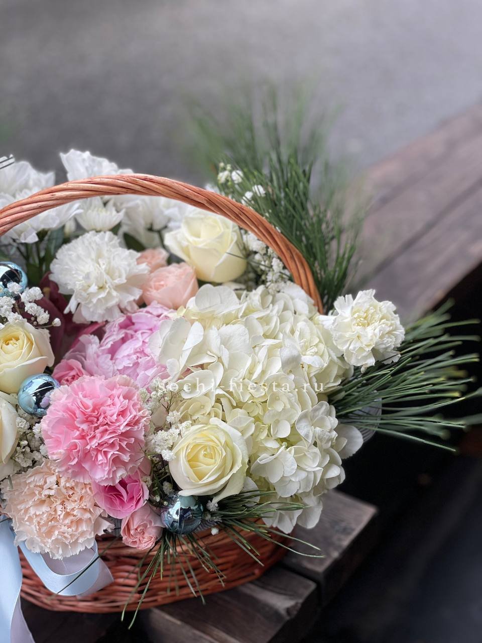 гортензия, роза, игрушки, хризантемы, диантусы, гипсофила, ель, бомбастик, корзина, оазис, лента.