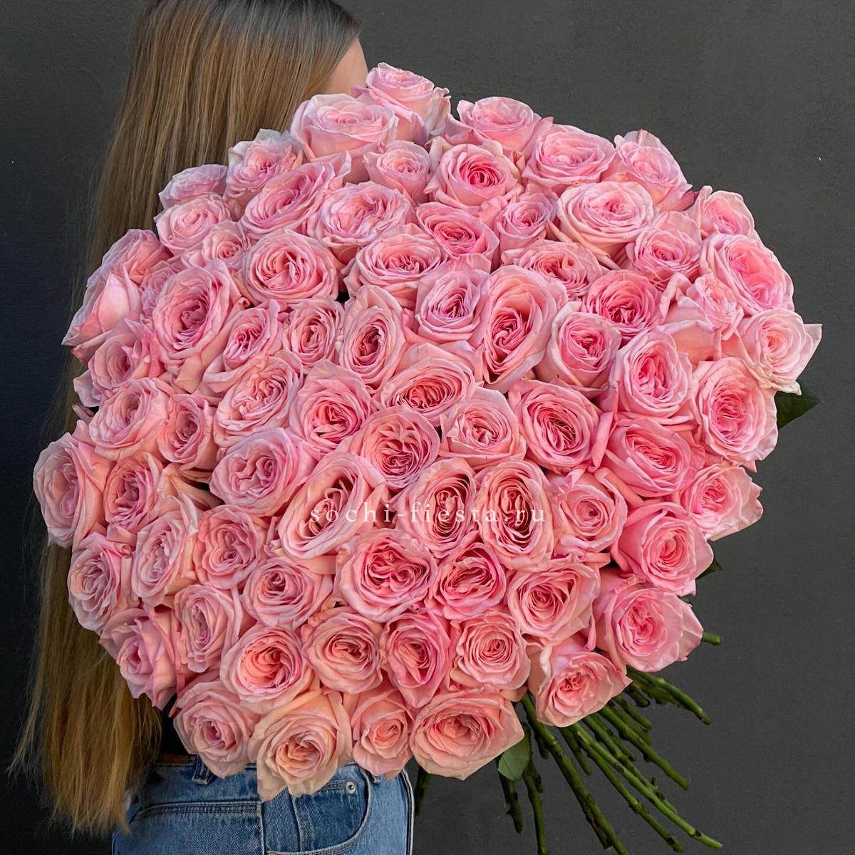 Сто один бутон в бело-розовой палитре создают объёмное облако цвета. Композиция впечатляет масштабом и наполняет пространство мягким сиянием лепестков.