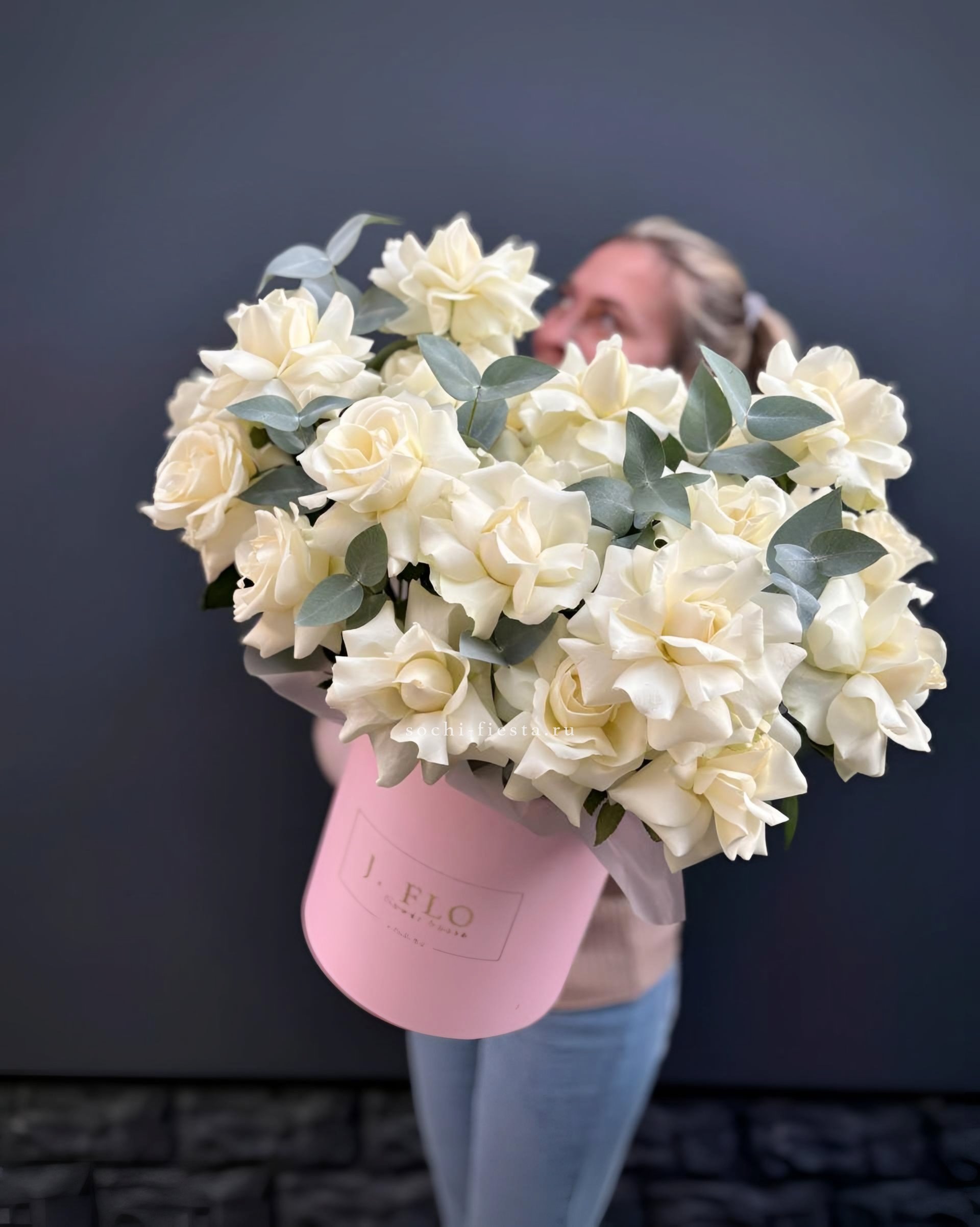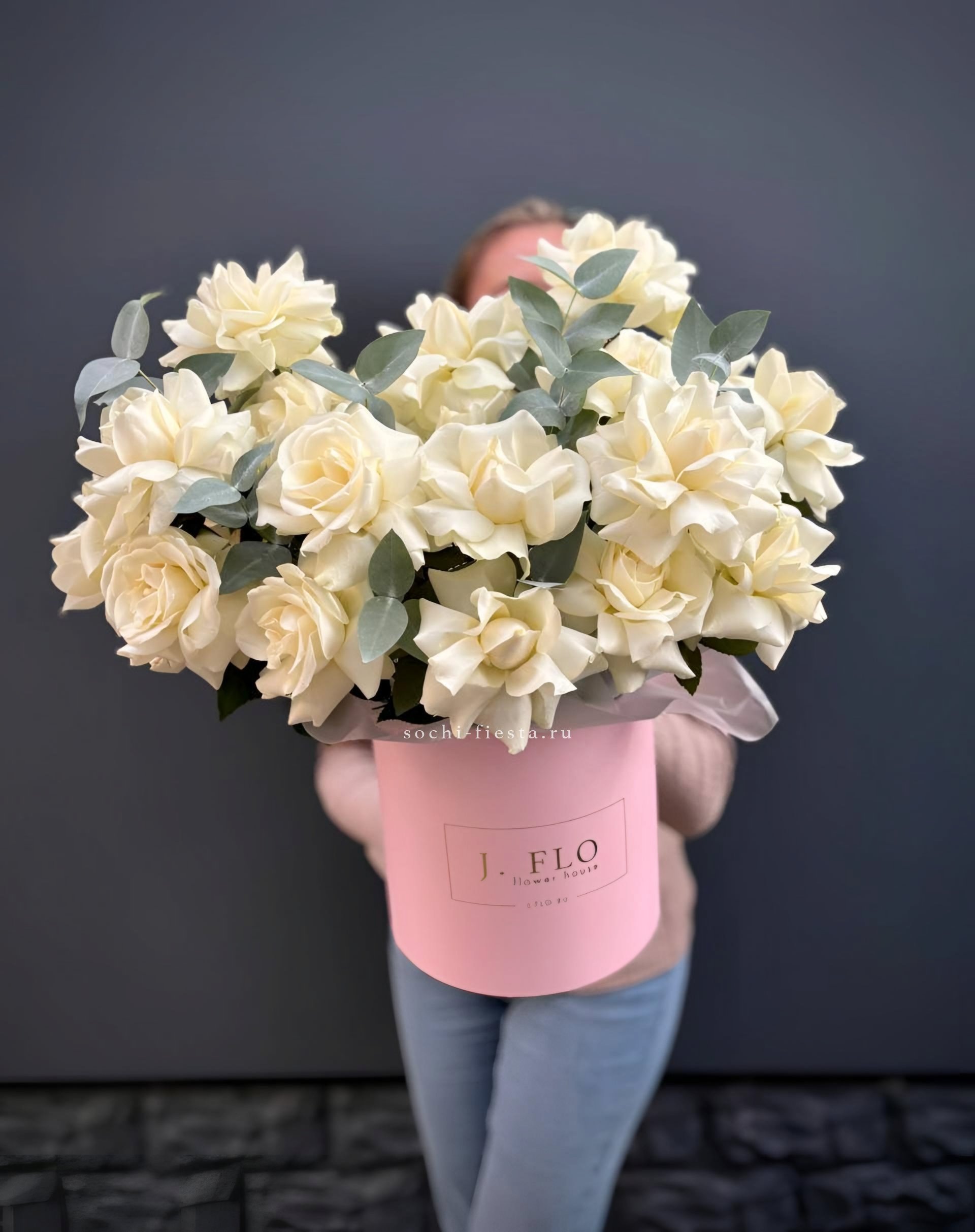 белые розы с эвкалиптом в сумочке.