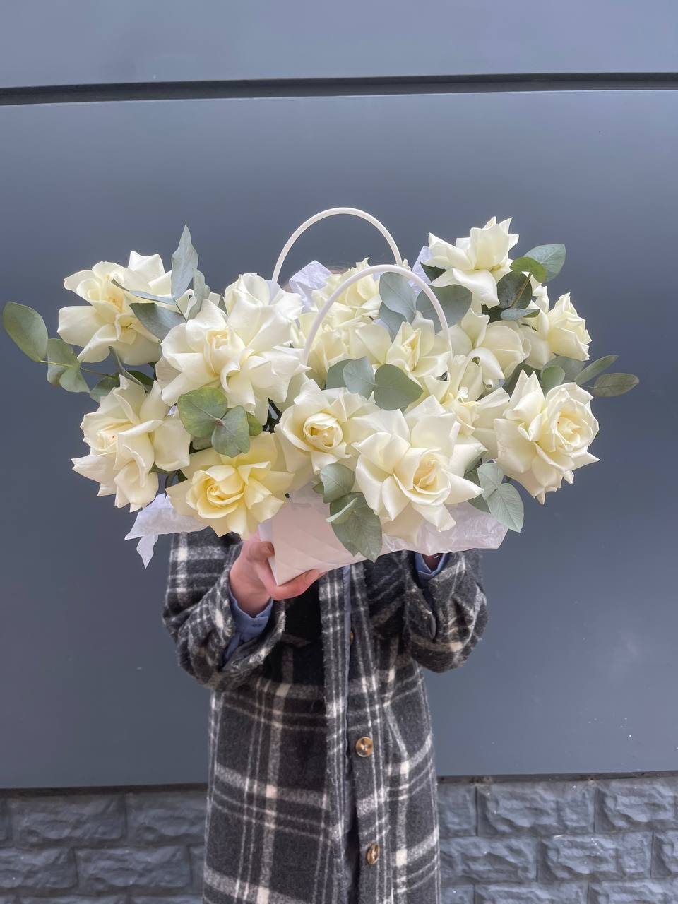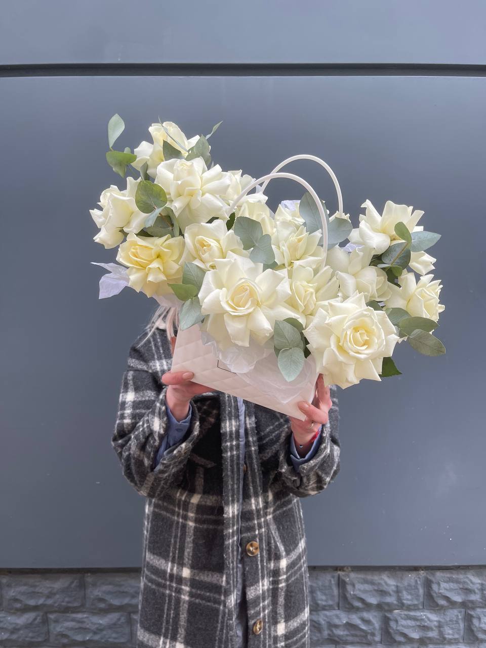 Пятнадцать белых роз собраны в аккуратную сумочку с веточками эвкалипта. Компактная форма позволяет разместить композицию на столе или полке, а матовая зелень добавляет свежести классическому белому цвету.
