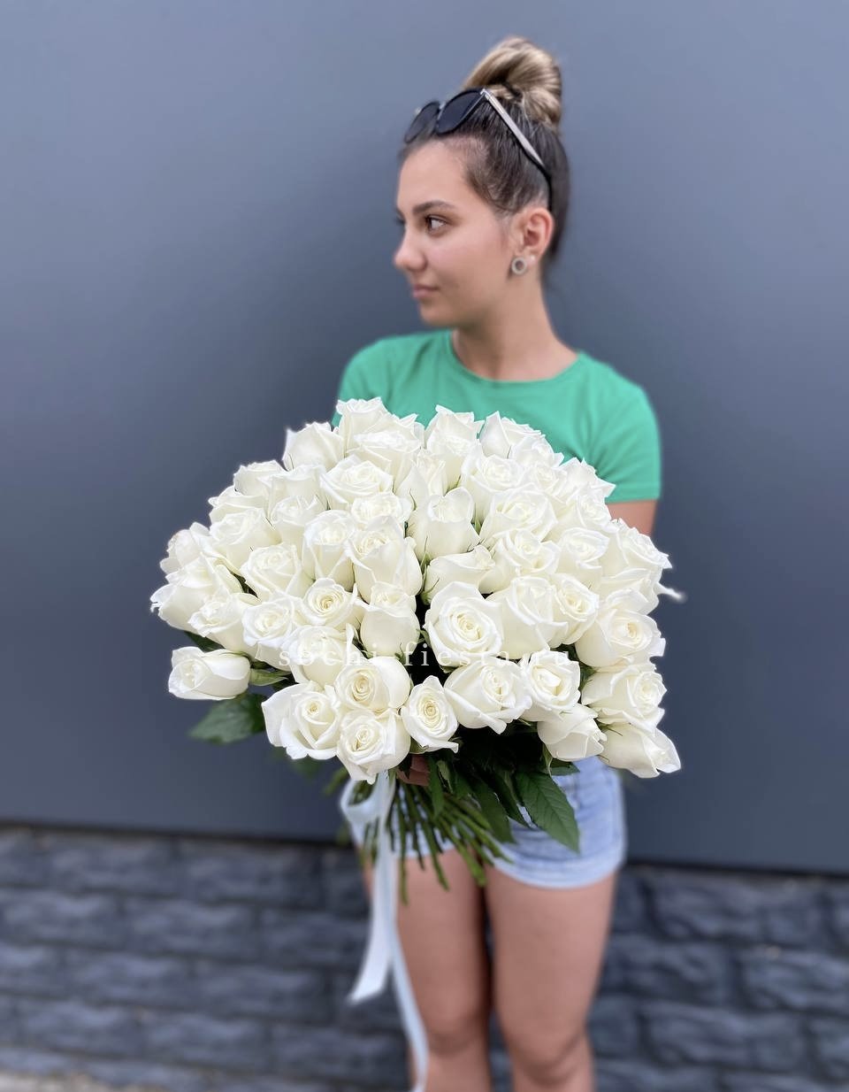Пятьдесят один бутон выстраиваются в объёмную сферу с чёткой геометрией. Белые розы держат форму и создают ощутимое визуальное присутствие. Букет занимает пространство уверенно и спокойно.