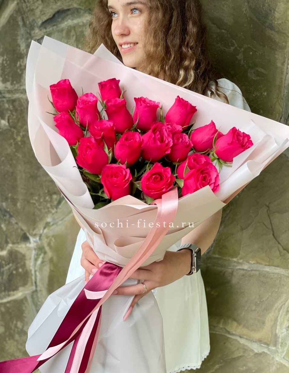 Алые розы образуют монохромную композицию с чёткой структурой и выразительным силуэтом. Девятнадцать бутонов создают объёмную форму, которая привлекает внимание с первого взгляда.