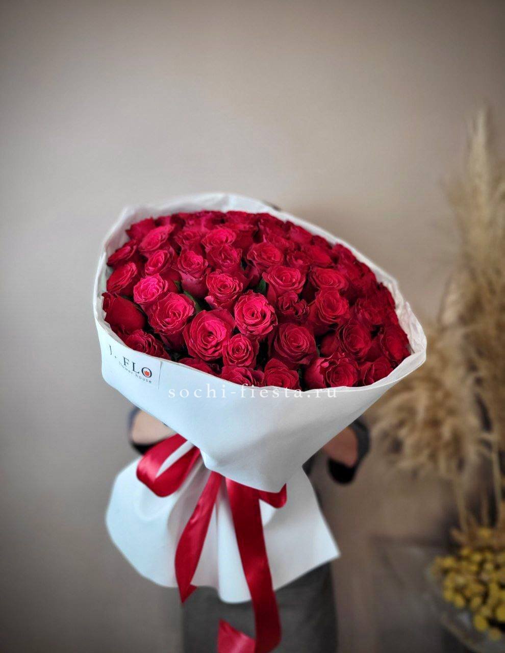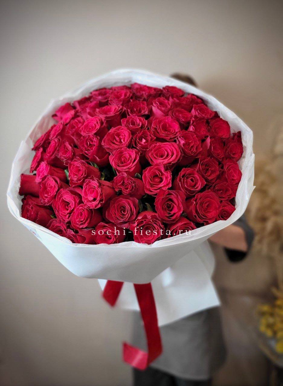 Семьдесят один бутон алого цвета образует масштабную композицию с мощным визуальным эффектом. Плотное наполнение и выразительная высота делают букет центром внимания в любом интерьере.