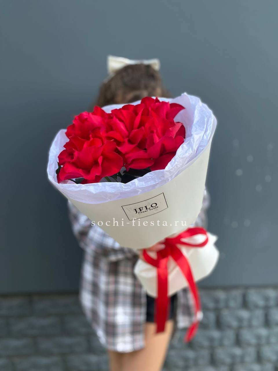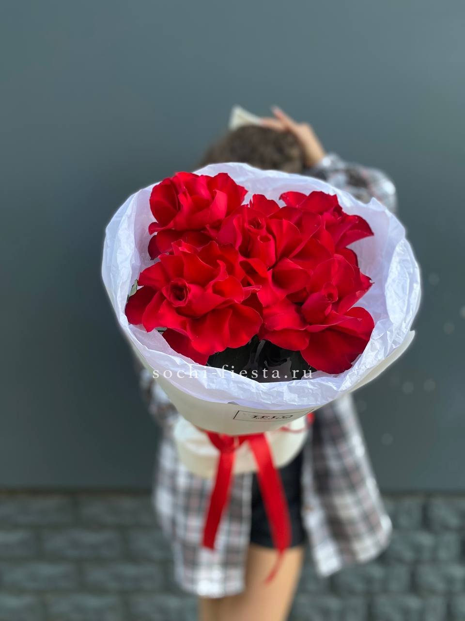 Девять красных бутонов в обрамлении свежего эвкалипта и крафтовой обёртки. Лаконичная сборка для тех, кто ценит простоту и выразительность цвета без лишних деталей.