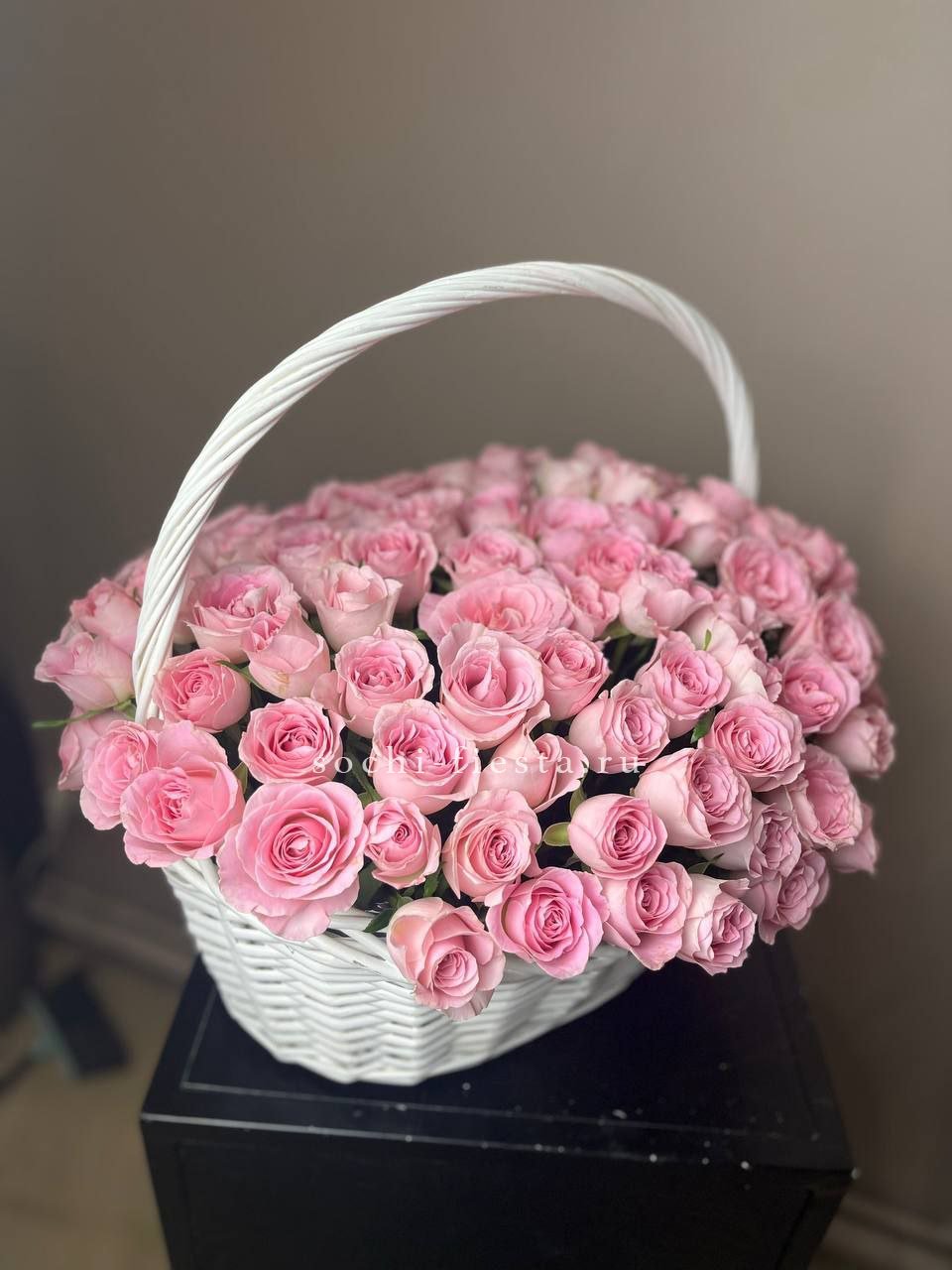 Сто один бутон в плетёной корзине создают впечатление цветущего сада прямо в руках. Розовые головки плотно заполняют пространство, формируя живую объёмную композицию с мягким свечением оттенков.