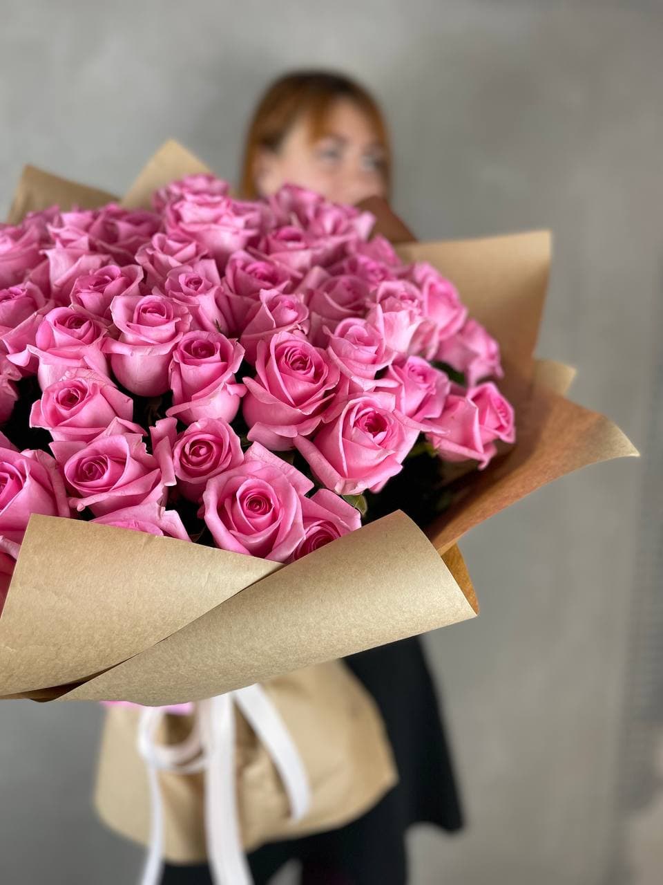 Пятьдесят одна роза собрана в плотный монохромный букет, где каждый бутон создаёт общий объём и глубину. Розовый оттенок раскрывается по-разному в зависимости от света и угла обзора. Композиция впечатляет масштабом и цельностью формы.
