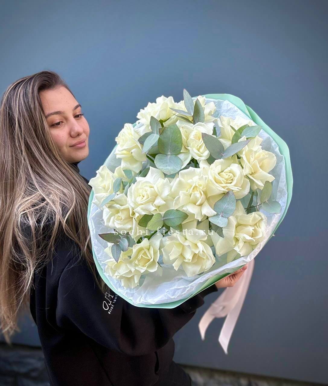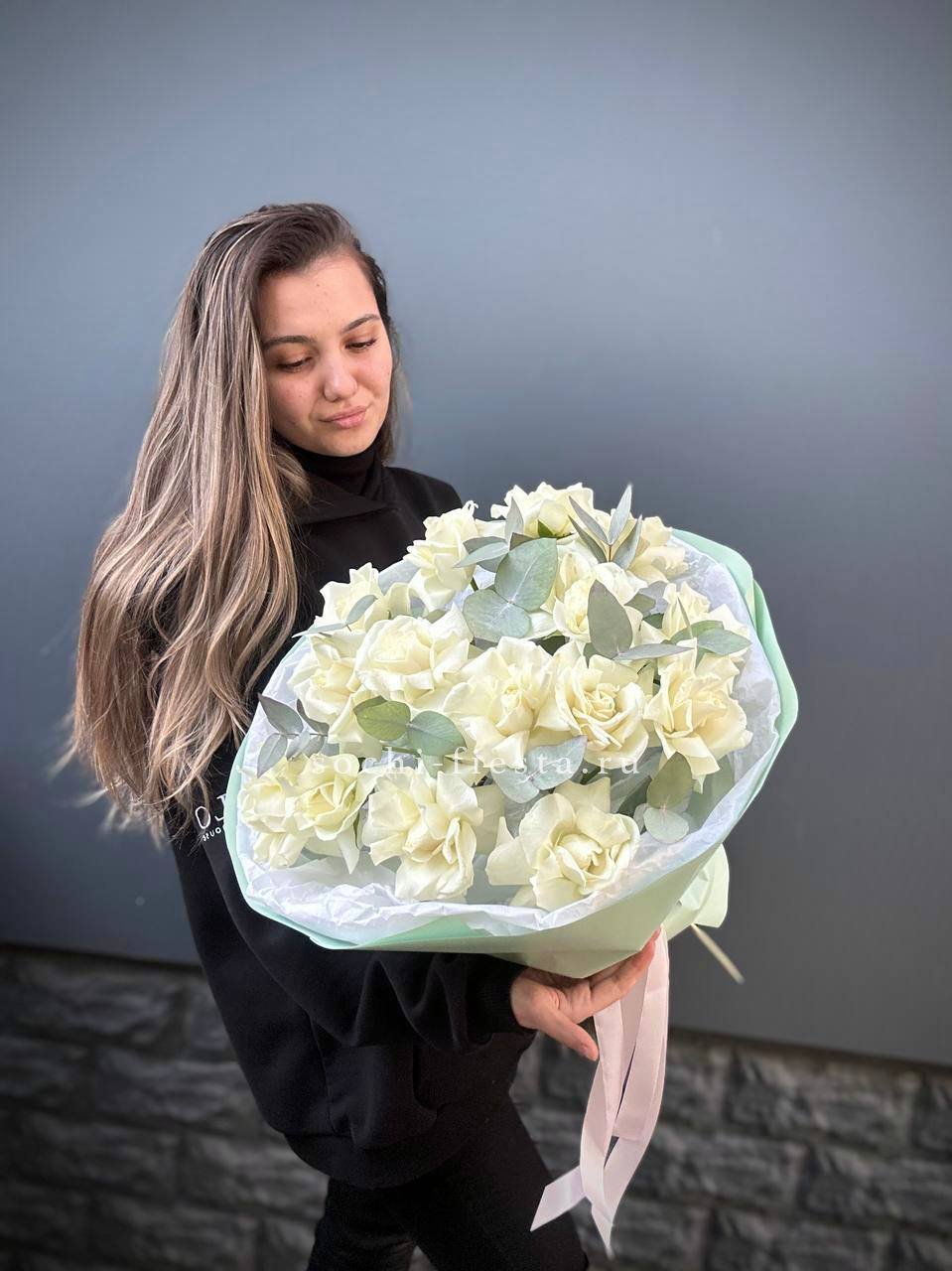 французские розы - 11 шт., эвкалипт-1шт, лента, авторская упаковка.