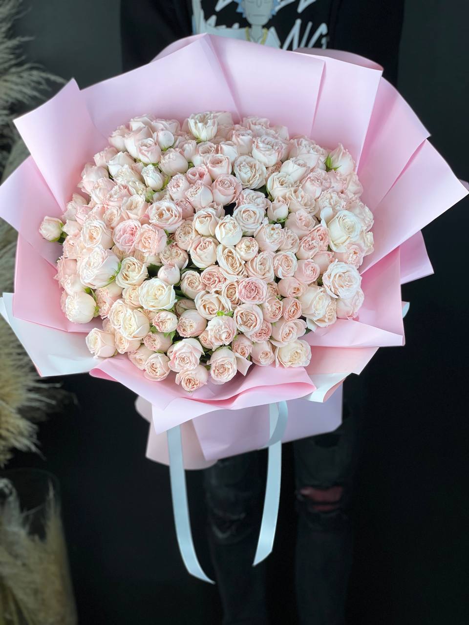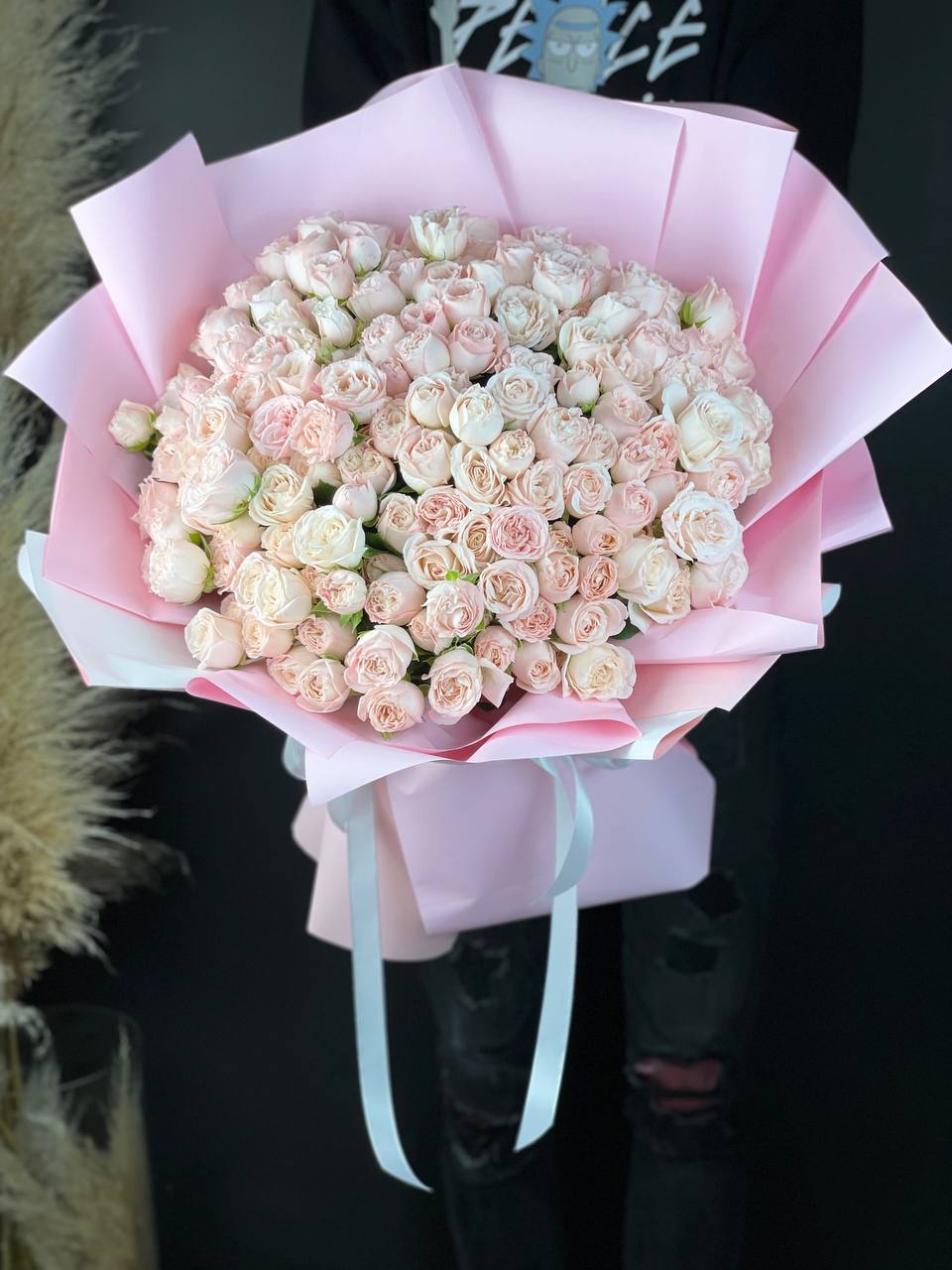Сто один стебель кустовой розы собраны в плотный букет с множеством мелких бутонов. Каждая ветвь раскрывается пышной шапкой соцветий, создавая объёмную текстуру и живую динамику композиции.