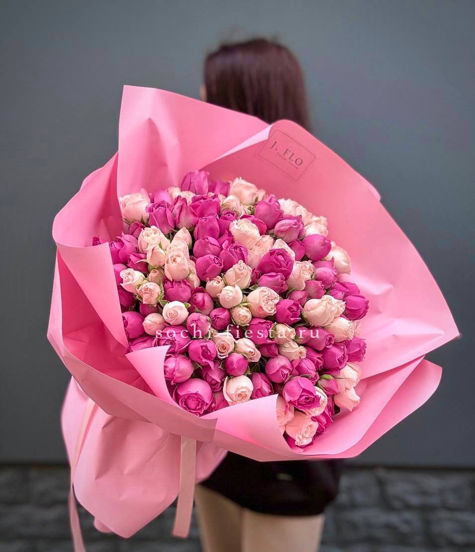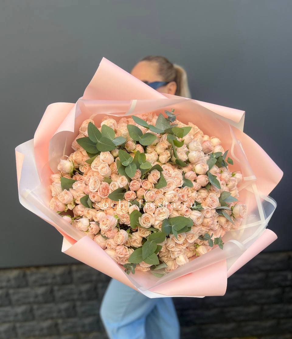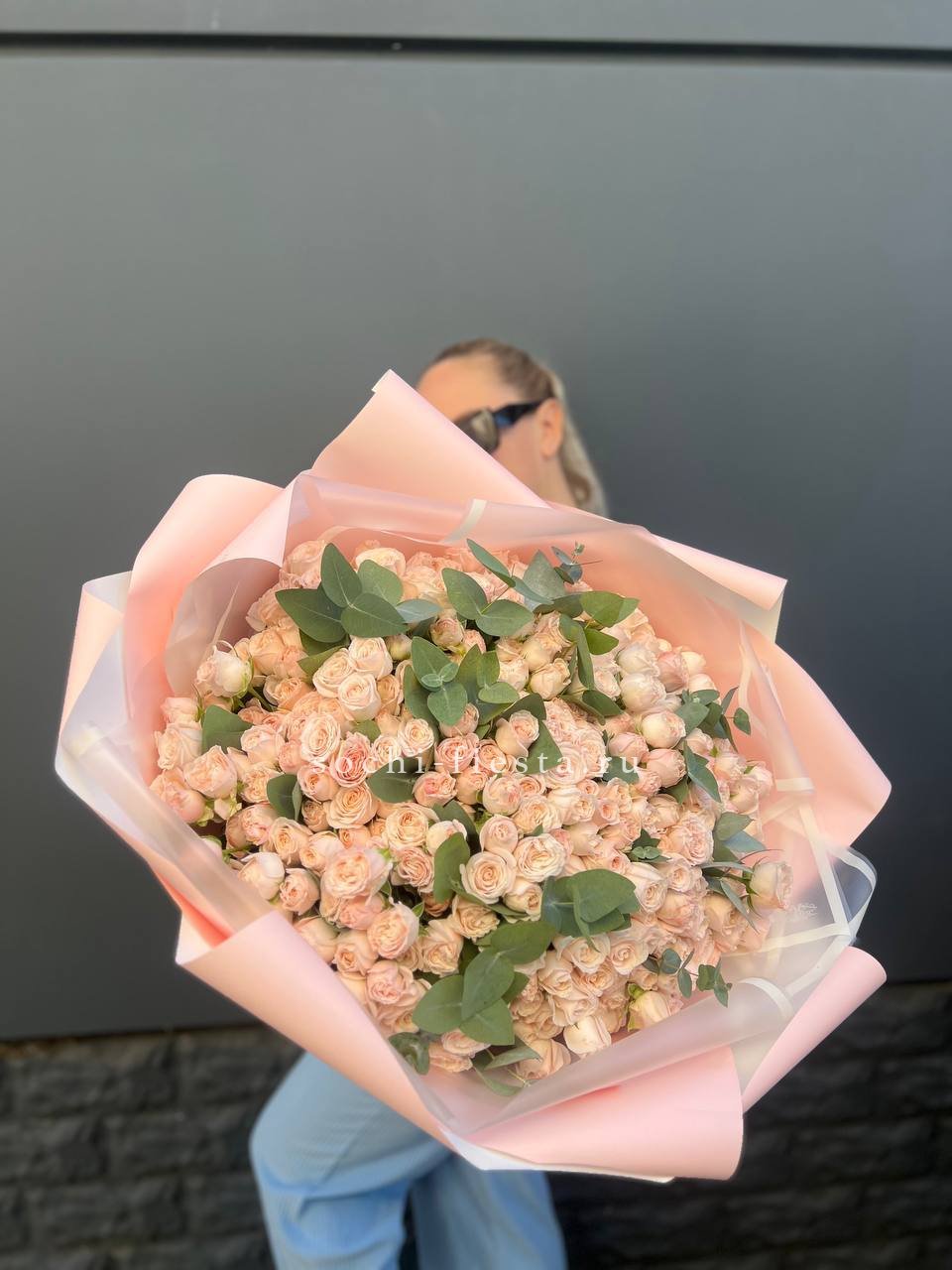 Пятьдесят один бутон сорта Бомбастик с густомахровыми лепестками кремового оттенка. Плотная сборка создает впечатляющий объем и заполняет пространство. Монобукет для тех моментов, когда важен масштаб.