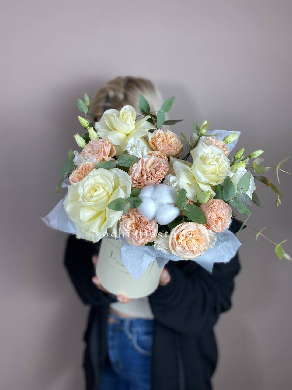 кустовая пионовидная роза, лента, дизайнерская упаковка.