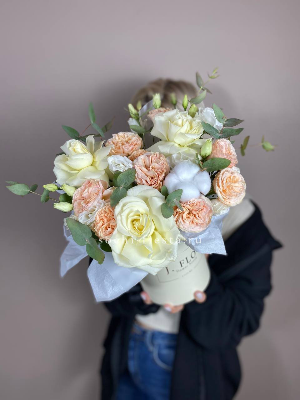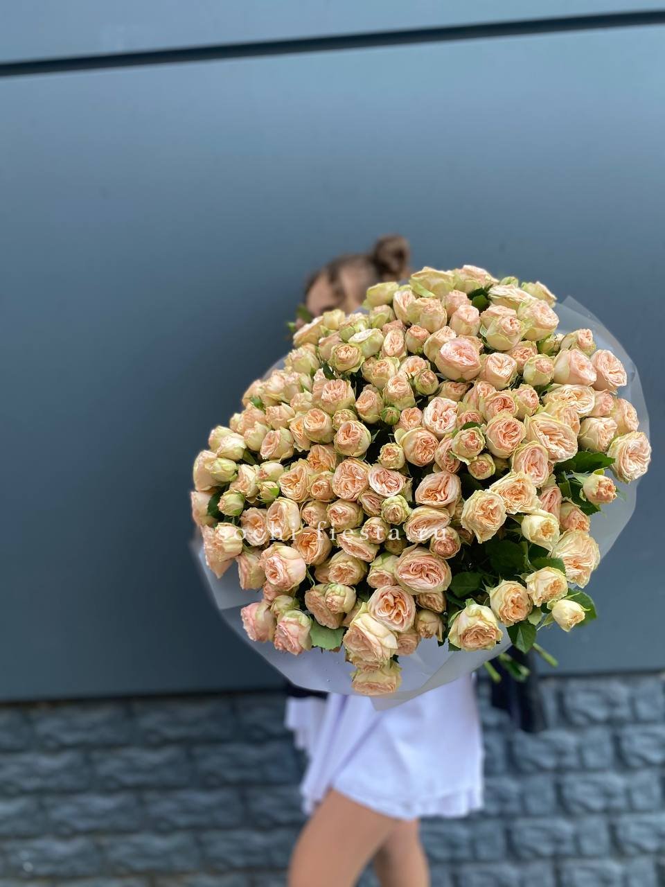 Пятьдесят один бутон образует масштабную композицию, которая притягивает внимание и заполняет пространство. Пионовидные розы создают впечатление цветочного облака с мягкими переливами оттенков.