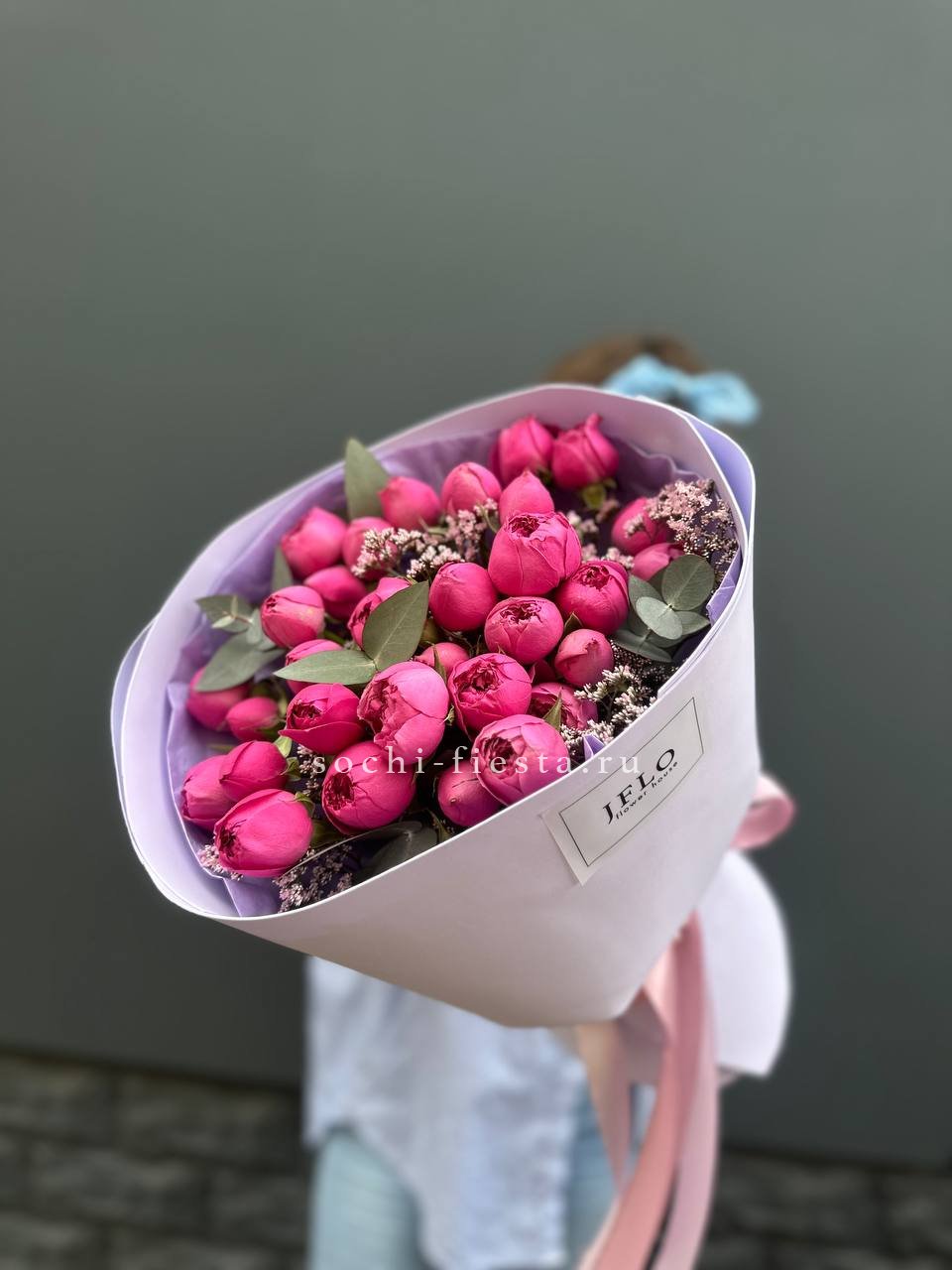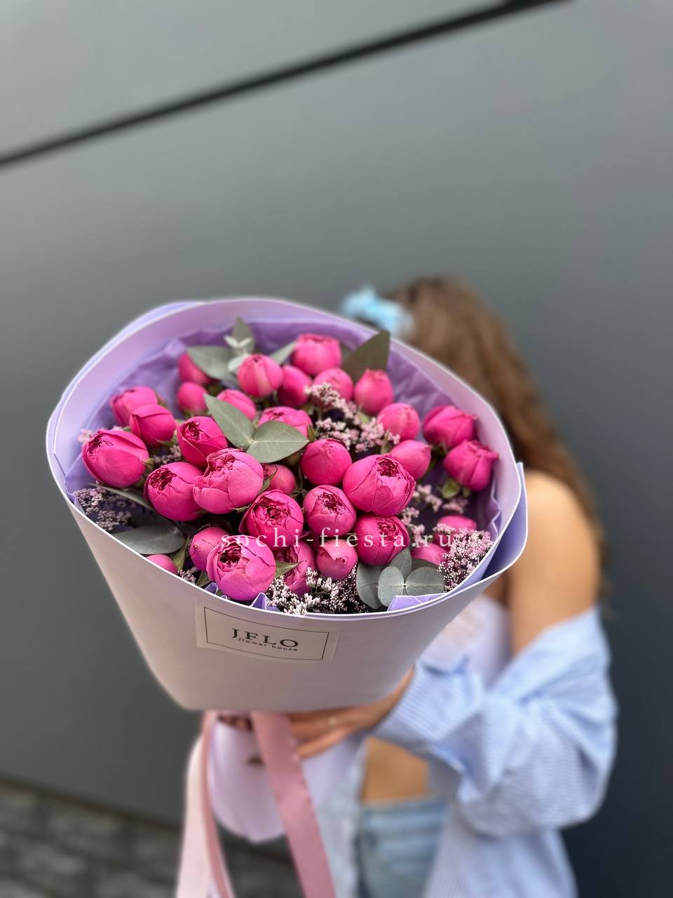 Спрей-розы раскрываются кустиками на гибких стеблях, образуя лёгкую живую структуру. Пятнадцать веток с множеством мелких бутонов придают букету естественную подвижность.
