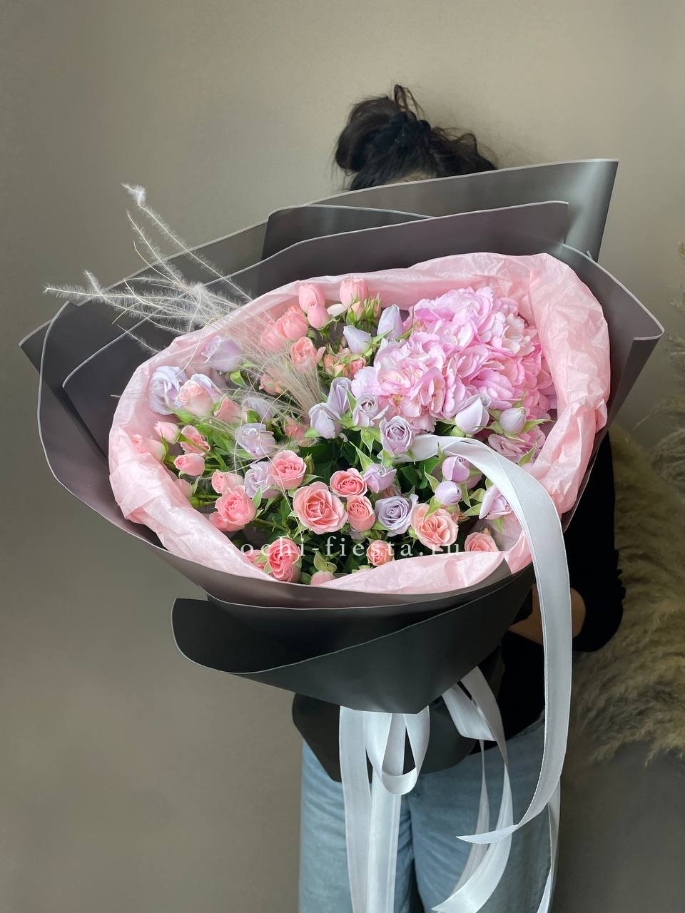 розовая роза, гортензия, диантус, эустома, эвкалипт, лента, дизайнерская упаковка.