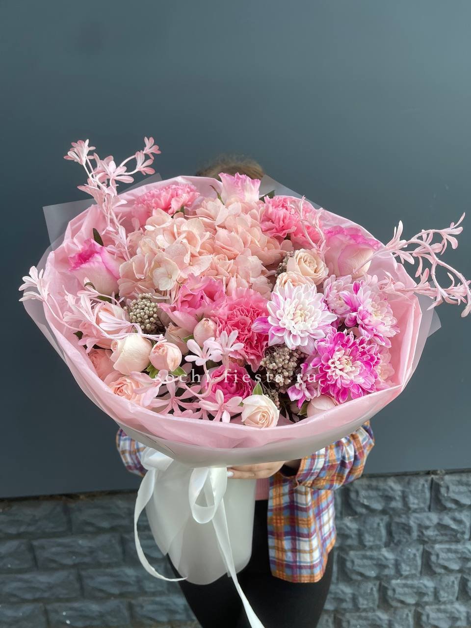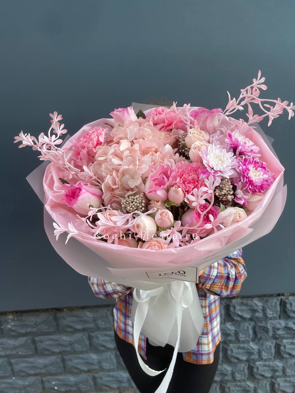 Воздушные соцветия гортензии переплетаются с бархатными бутонами диантусов и хризантем. Розы раскрываются среди зелени озотамуса. Композиция в пудровых оттенках с мягкой фактурой и объёмом.