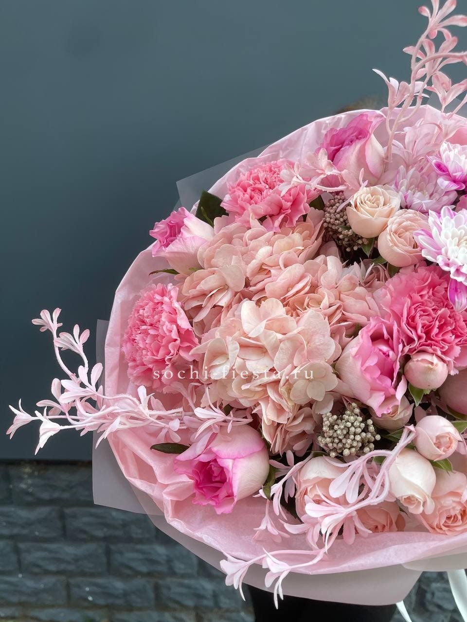 гортензия, диантус, хризантема, озотамус, розовые розы, оформление.