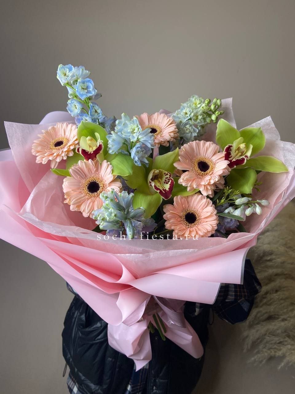 гербера, орхидея цимбидиум (или эквивалент), дельфиниум,  эвкалипт,  лента, дизайнерская упаковка.
