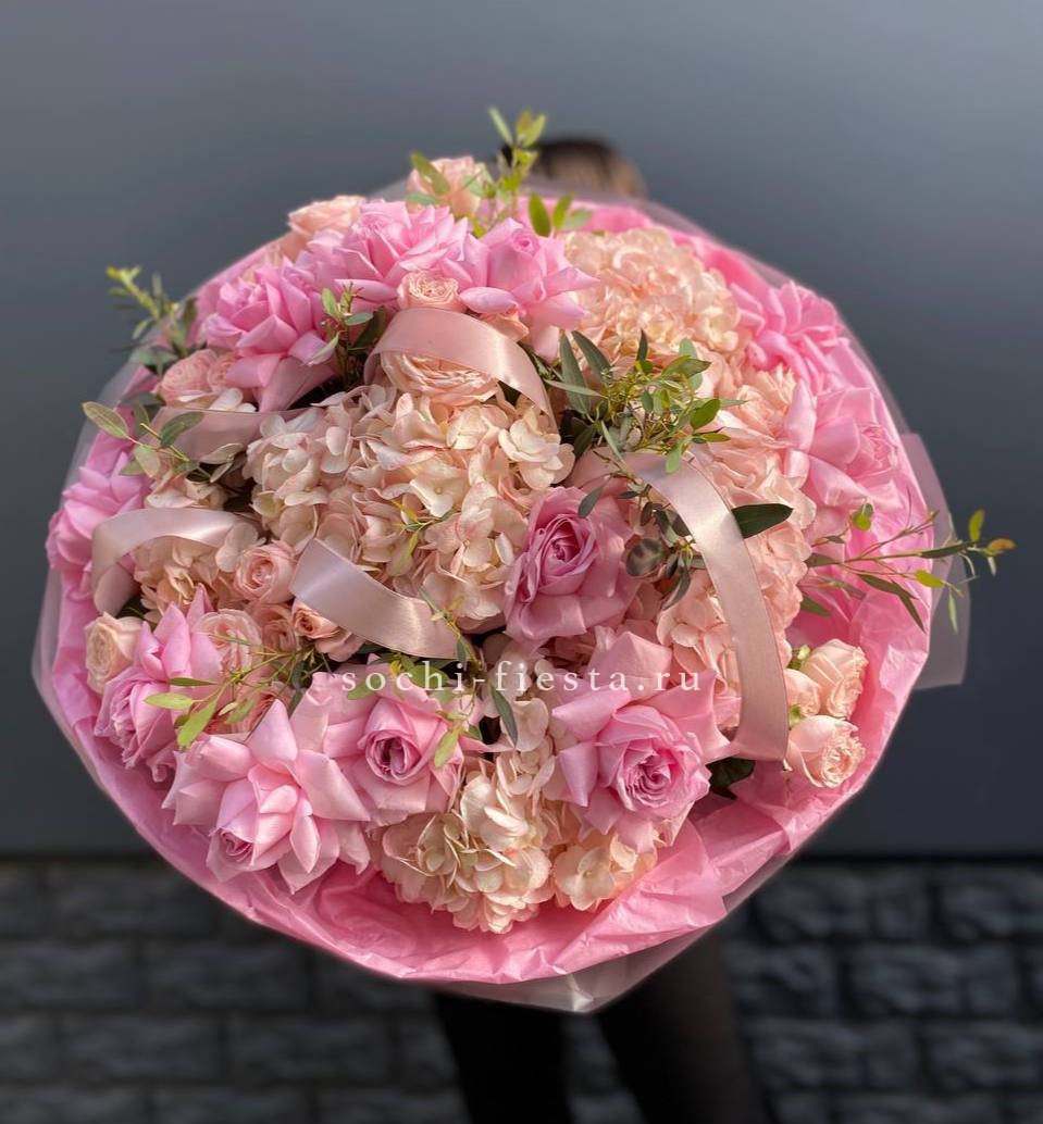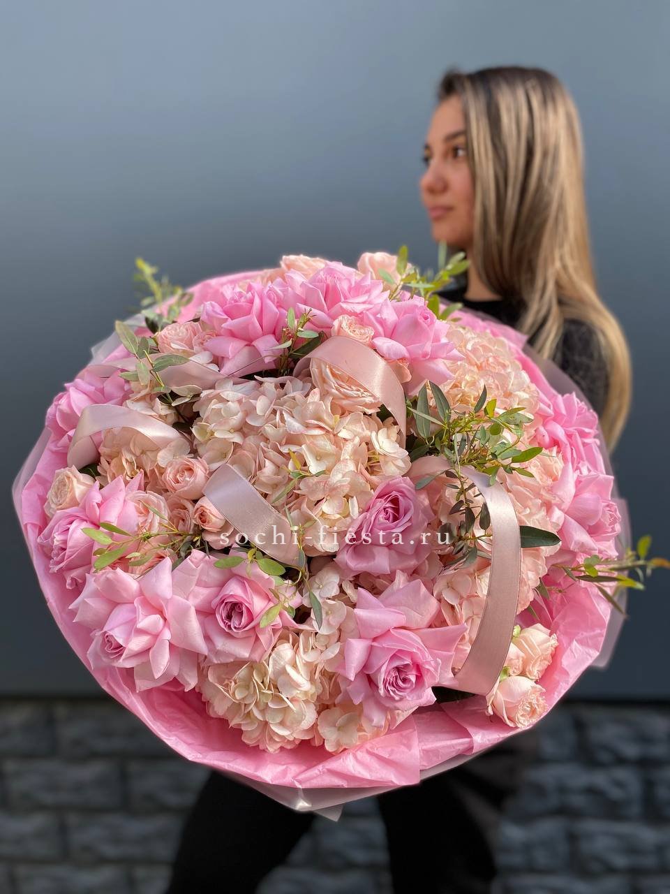 французские розы, маттиола, гортензии, эвкалипт, стифа, упаковка, лента.