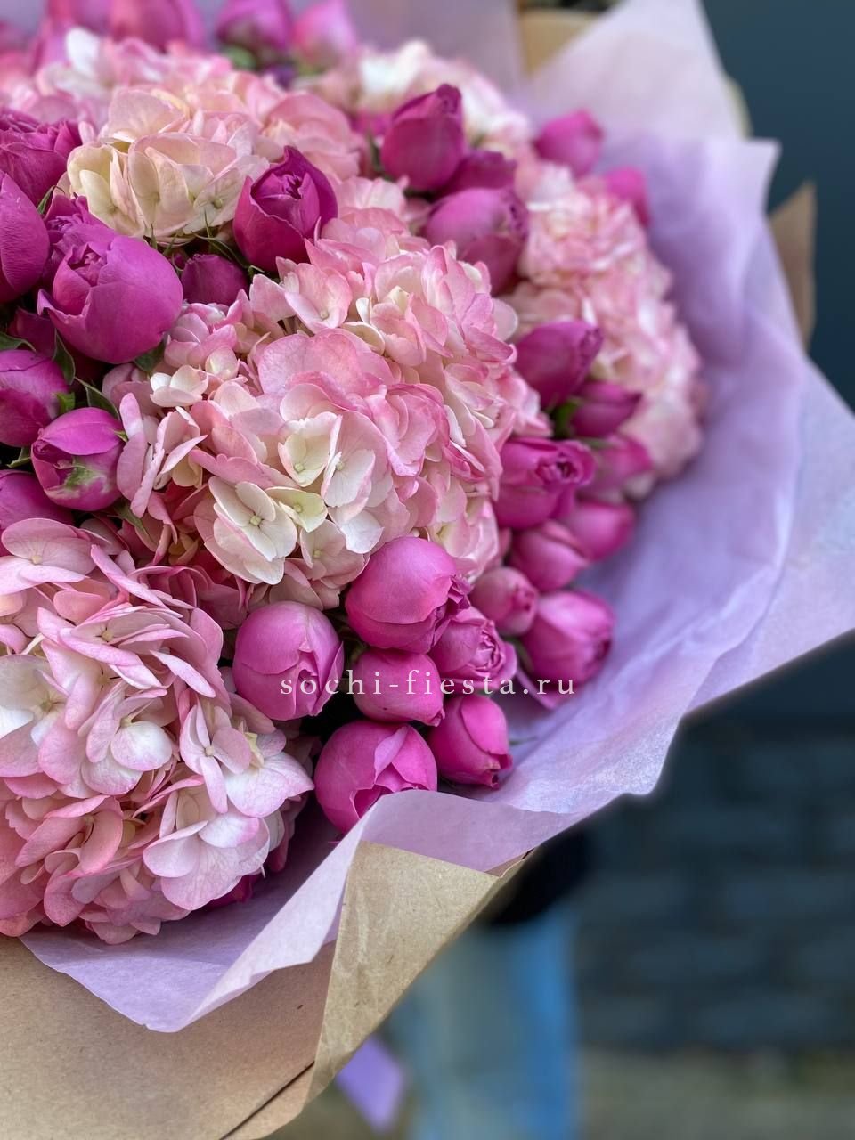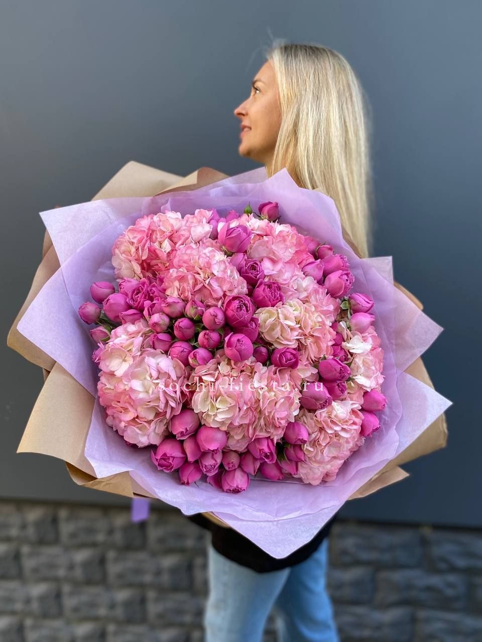 Пышные шапки гортензии создают воздушный объём, а белые розы добавляют графичности. Букет держит форму и легко размещается в любом пространстве.