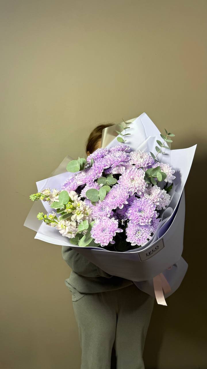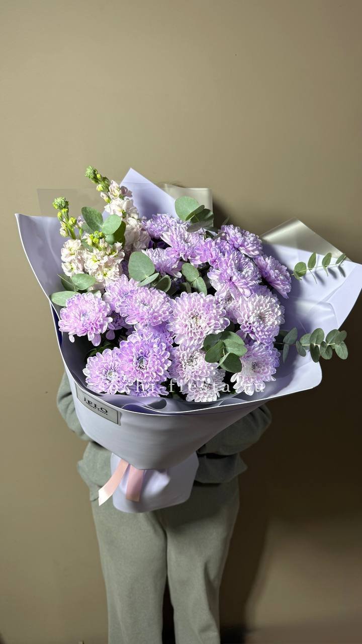 Воздушная композиция собирает кустовую хризантему, эустому и диантус в единый ритм. Озотамус и эвкалипт задают структуру, сохраняя свежесть надолго.