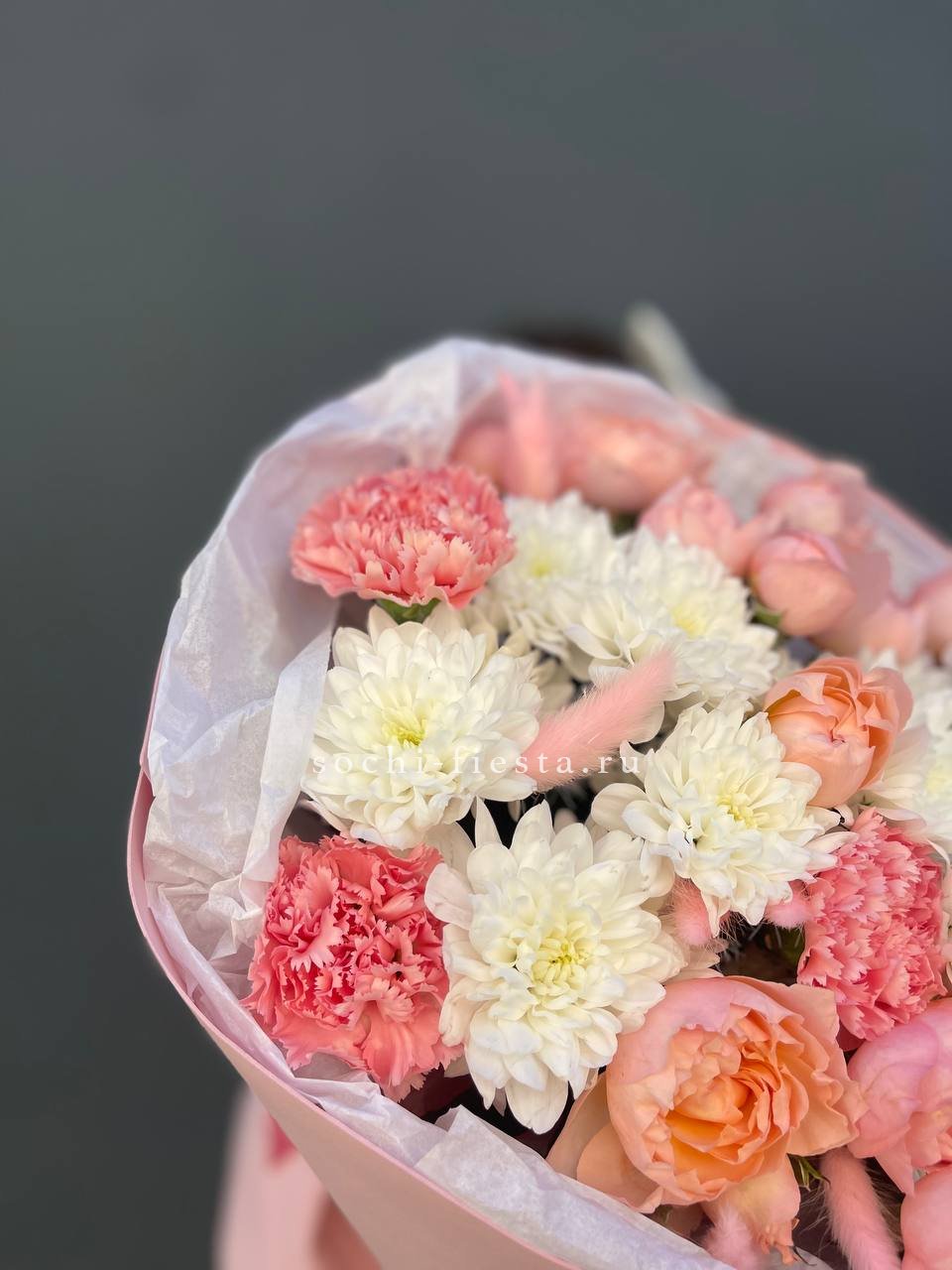 гортензия, диантус, хризантема, эустома, розы, озатамус, пленка.