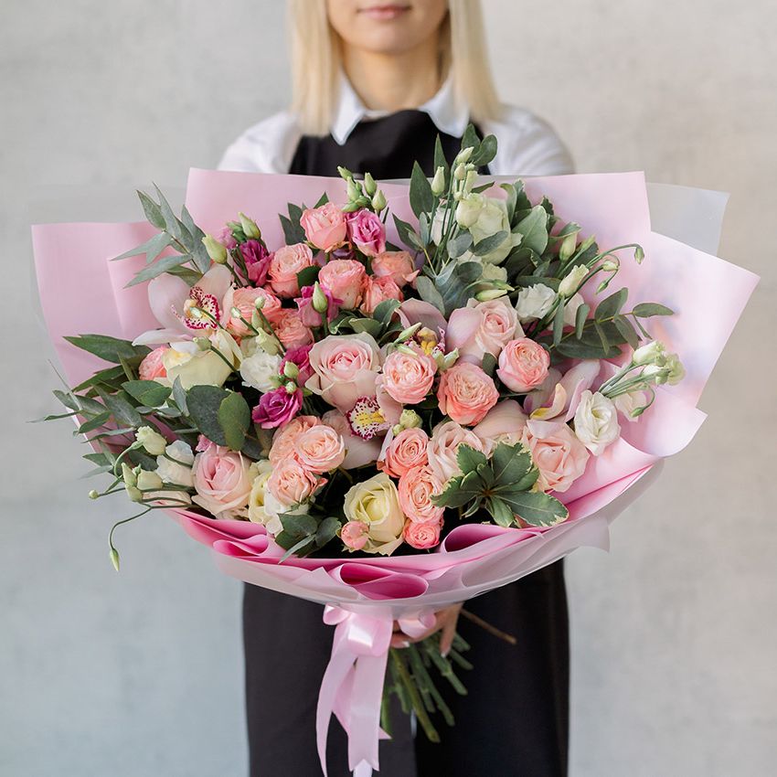 роза одноголовая, роза кустовая пионовидная, эустома, орхидея цимбидиум (или эквивалент), эвкалипт, лента, дизайнерская упаковка.