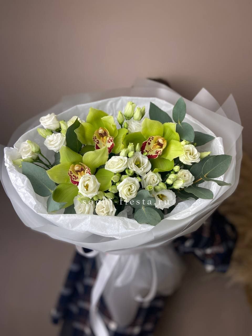 эустома, орхидея цимбидиум (или эквивалент), эвкалипт,  лента, дизайнерская упаковка.