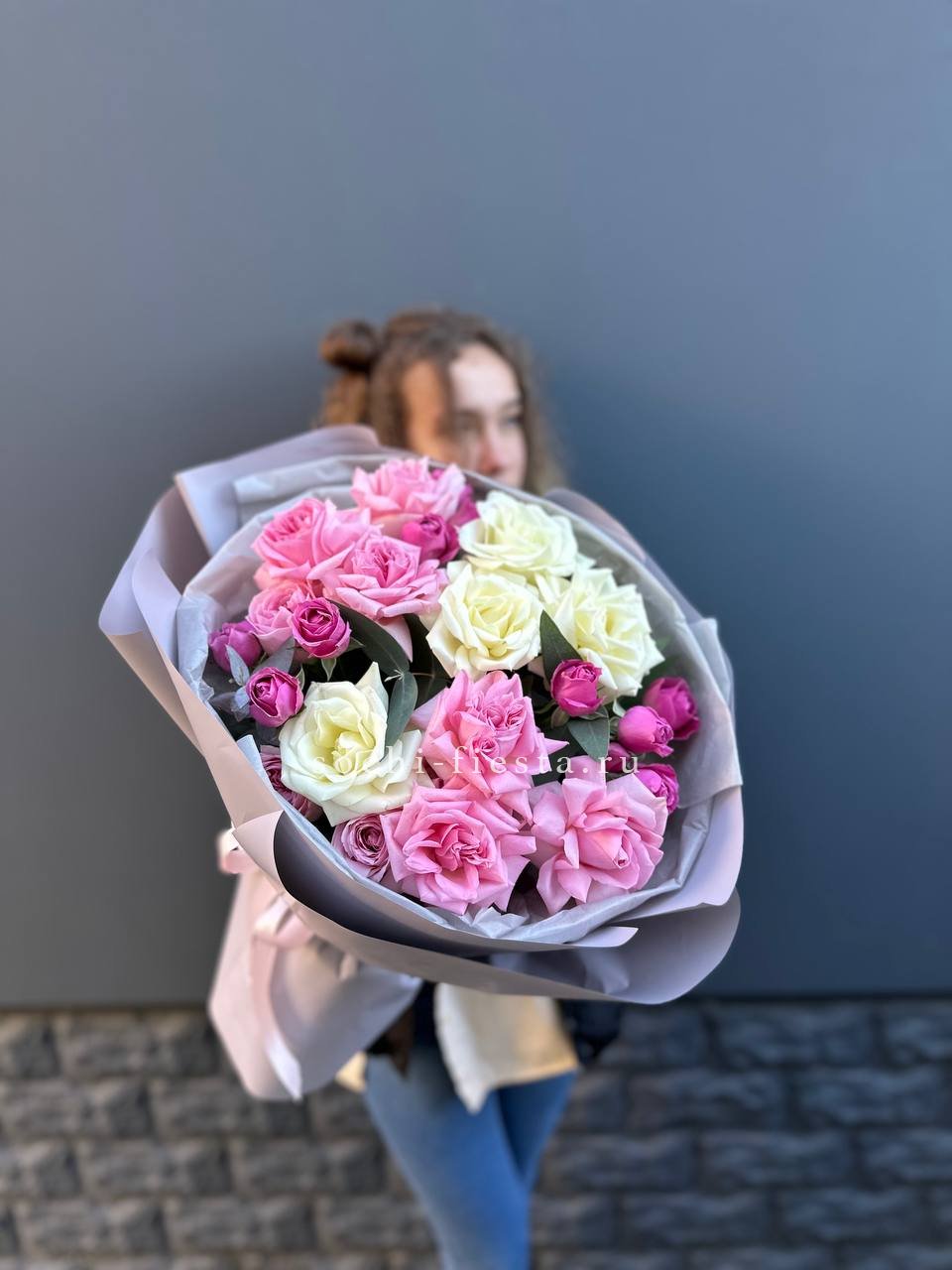 Монохромная палитра с многослойной структурой. Французские розы и эустомы чередуются с кустовыми бутонами, гортензии заполняют объём, а диантусы создают точечные акценты. Букет выглядит цельно и графично.