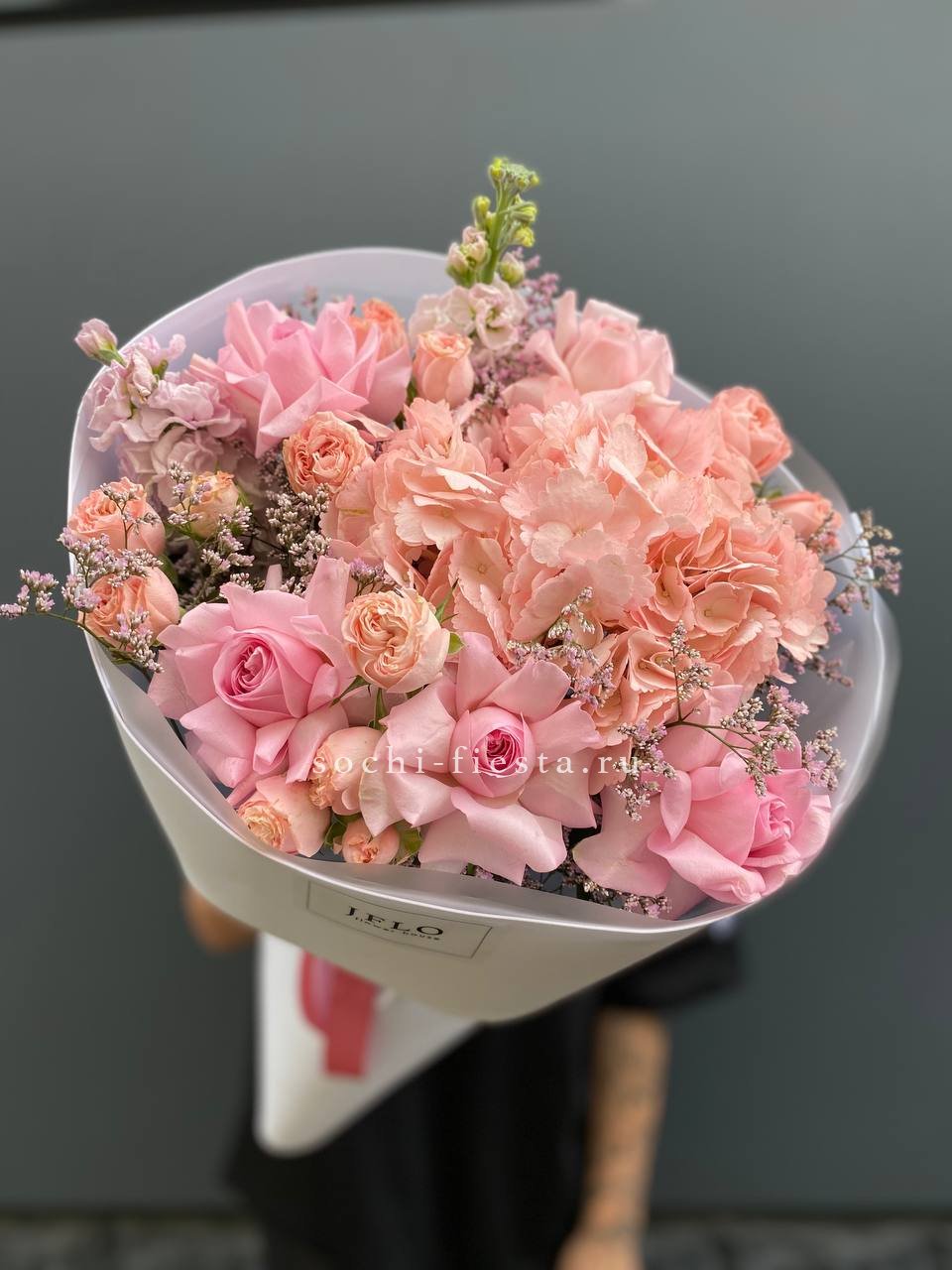 гортензия, розовые розы, кустовые розы, маттиолы,, лимониум лента и дизайнерская пленка.