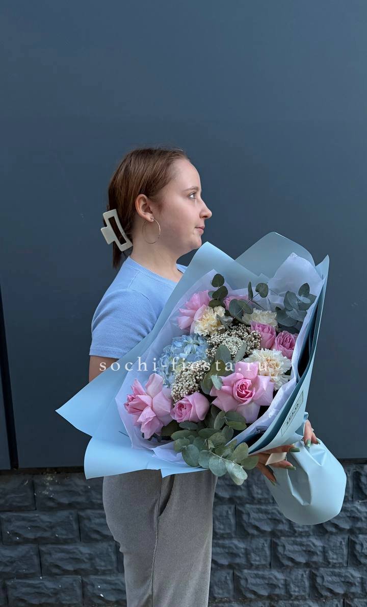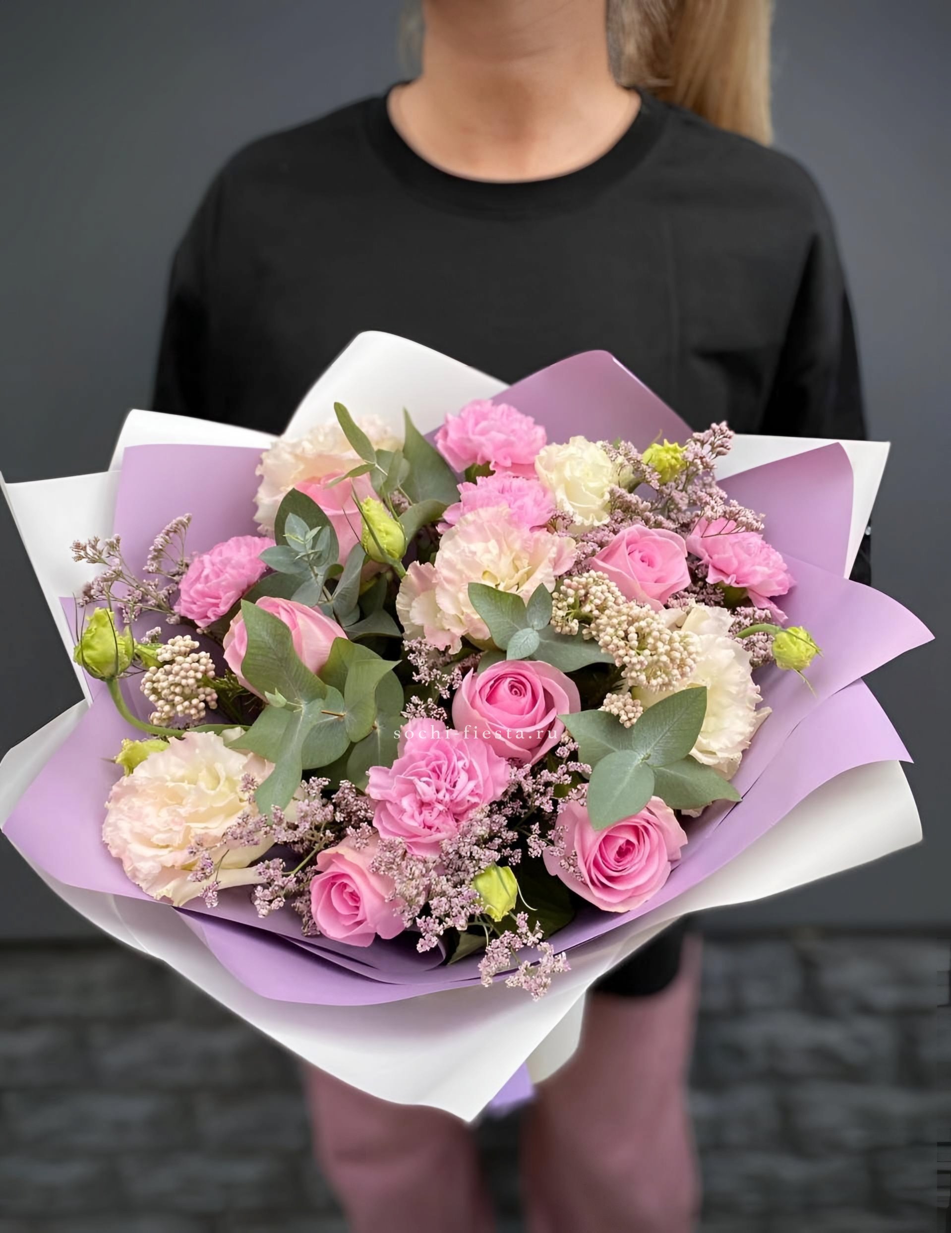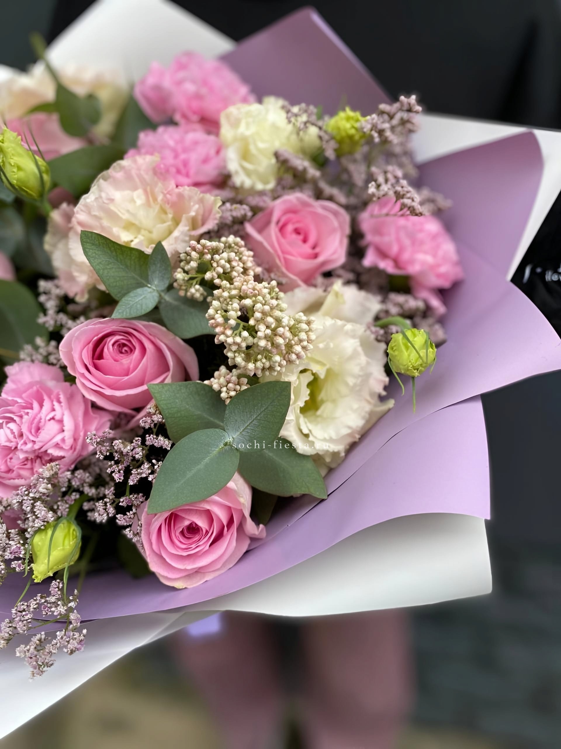 маттиола, диантусы, пионовидные розы Мисти Баблс, эвкалипт, лимониум, эустома лента, упаковка.
