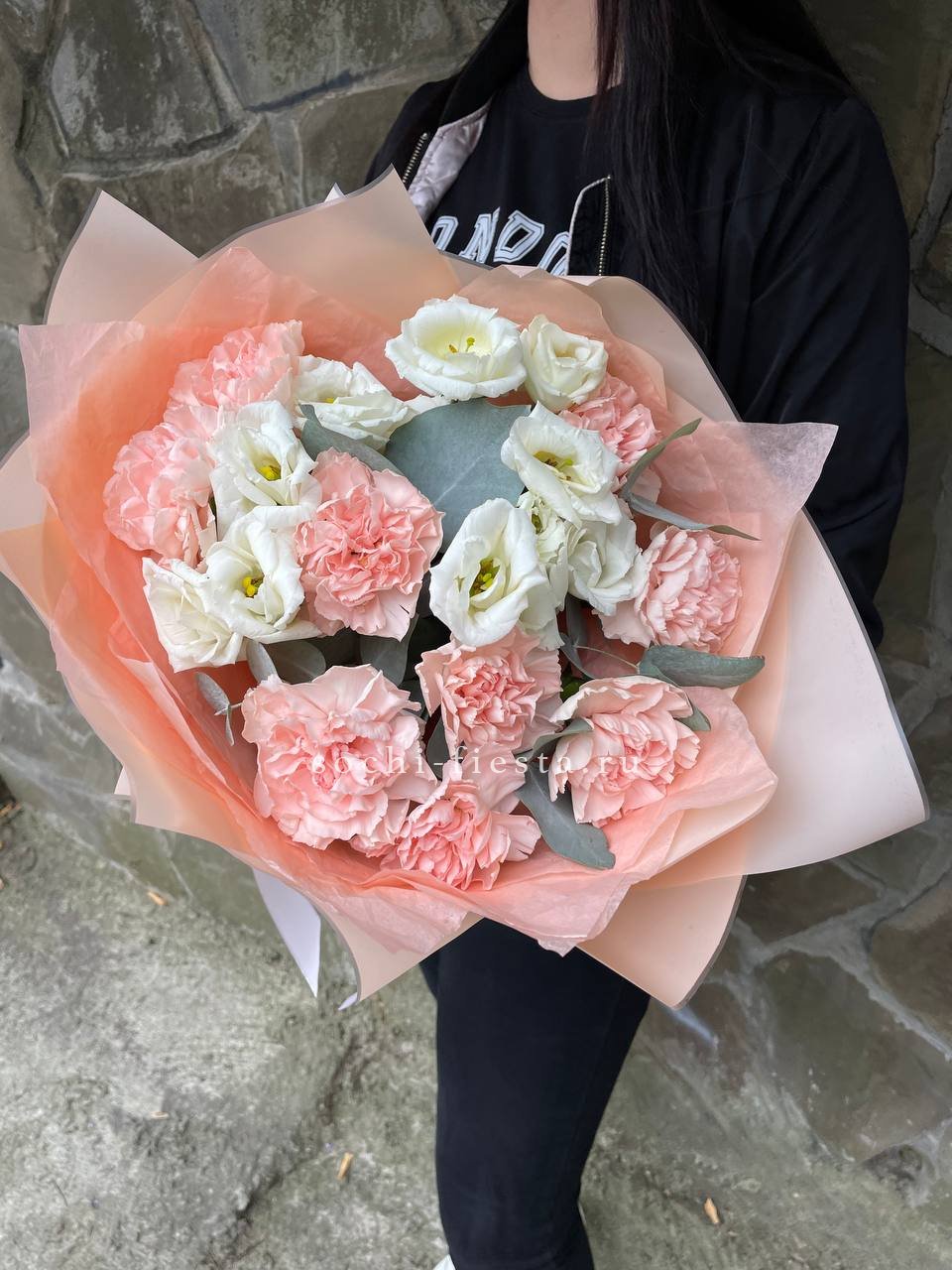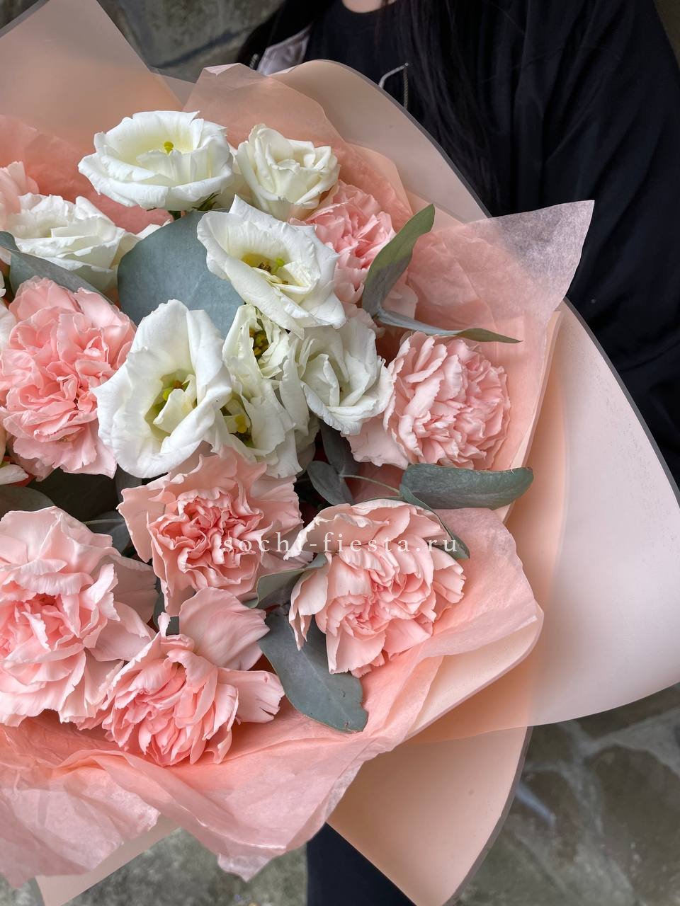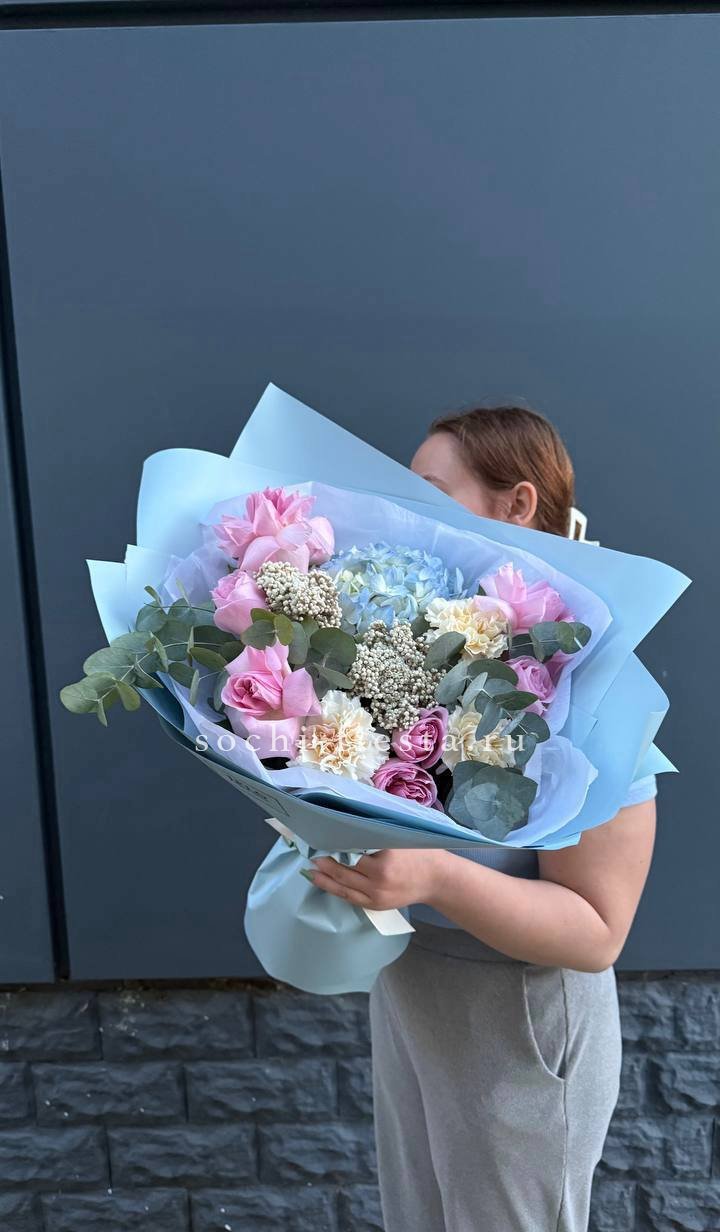 маттиола, диантусы, пионовидные розы Мисти Баблс, эвкалипт, лимониум, эустома лента, упаковка.