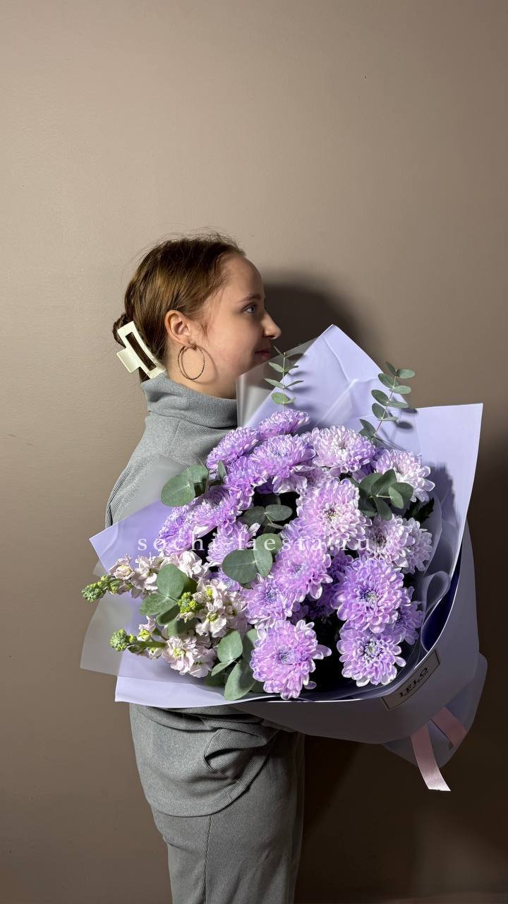 Кустовая хризантема и маттиола образуют гармоничную пару с разной фактурой бутонов. Эвкалипт добавляет свежести и завершает композицию естественными линиями.