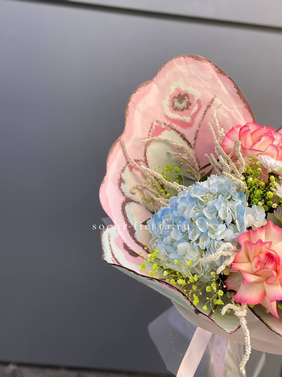 розовые розы, белые розы, диантус, бомбастик, гортензия, эвкалипт, пленка.