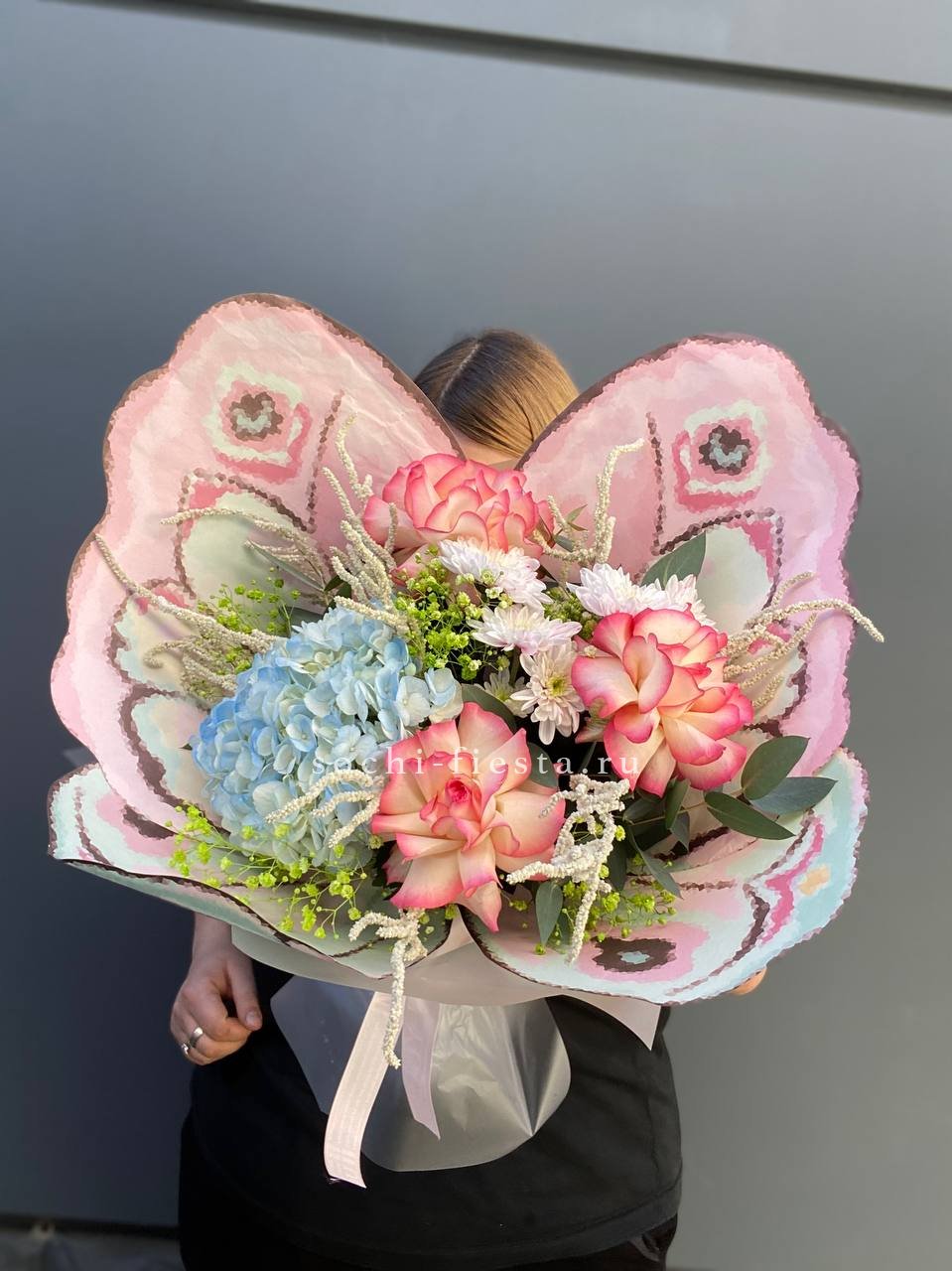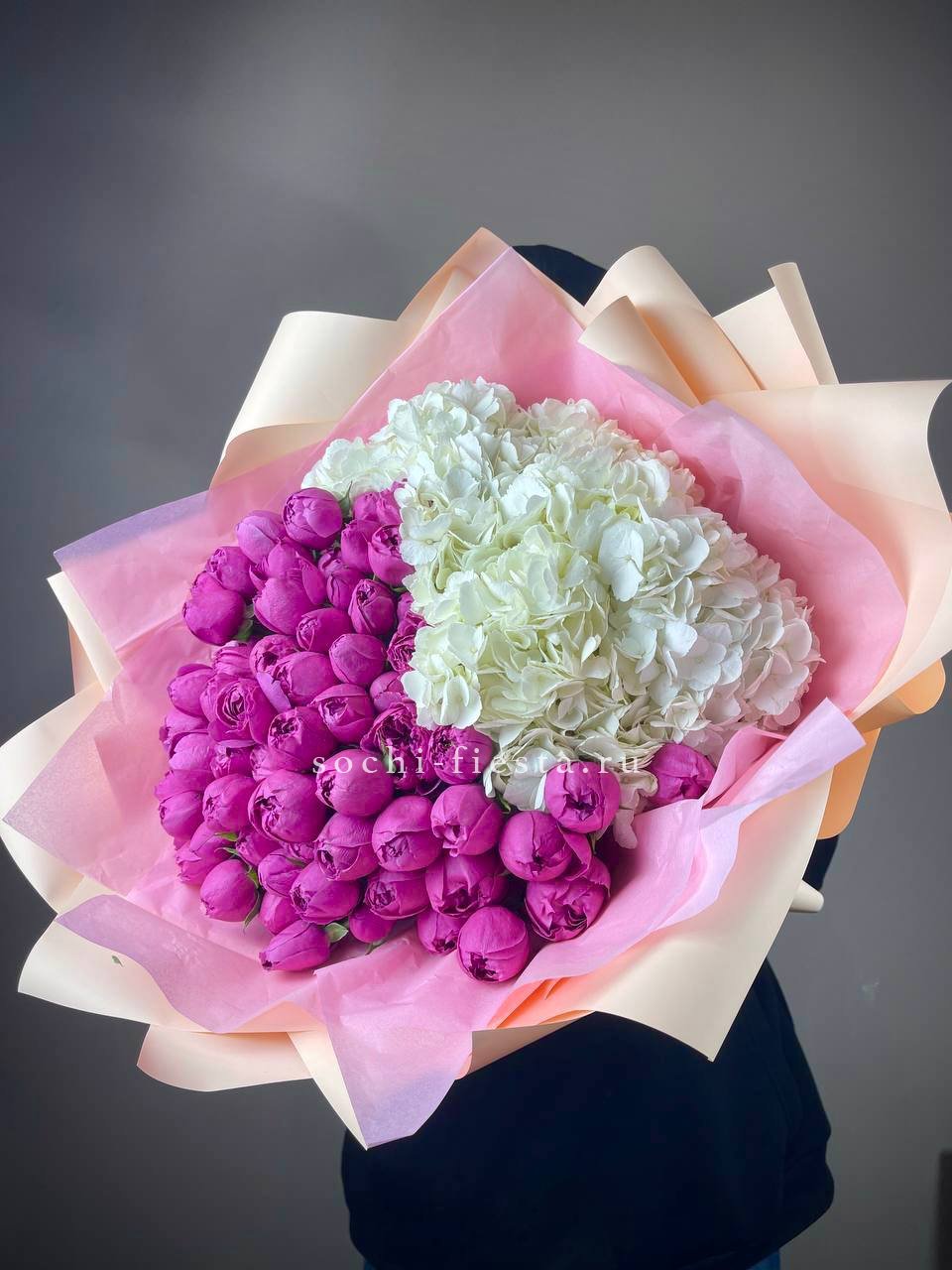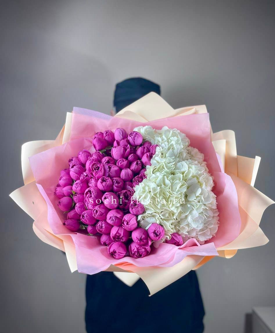 Пышная шапка из роз двух оттенков с объёмной гортензией и воздушным диантусом создаёт мягкий переход от белого к розовому. Бомбастик добавляет букету плотности, а эвкалипт освежает общую композицию. Универсальное решение для яркого поздравления.