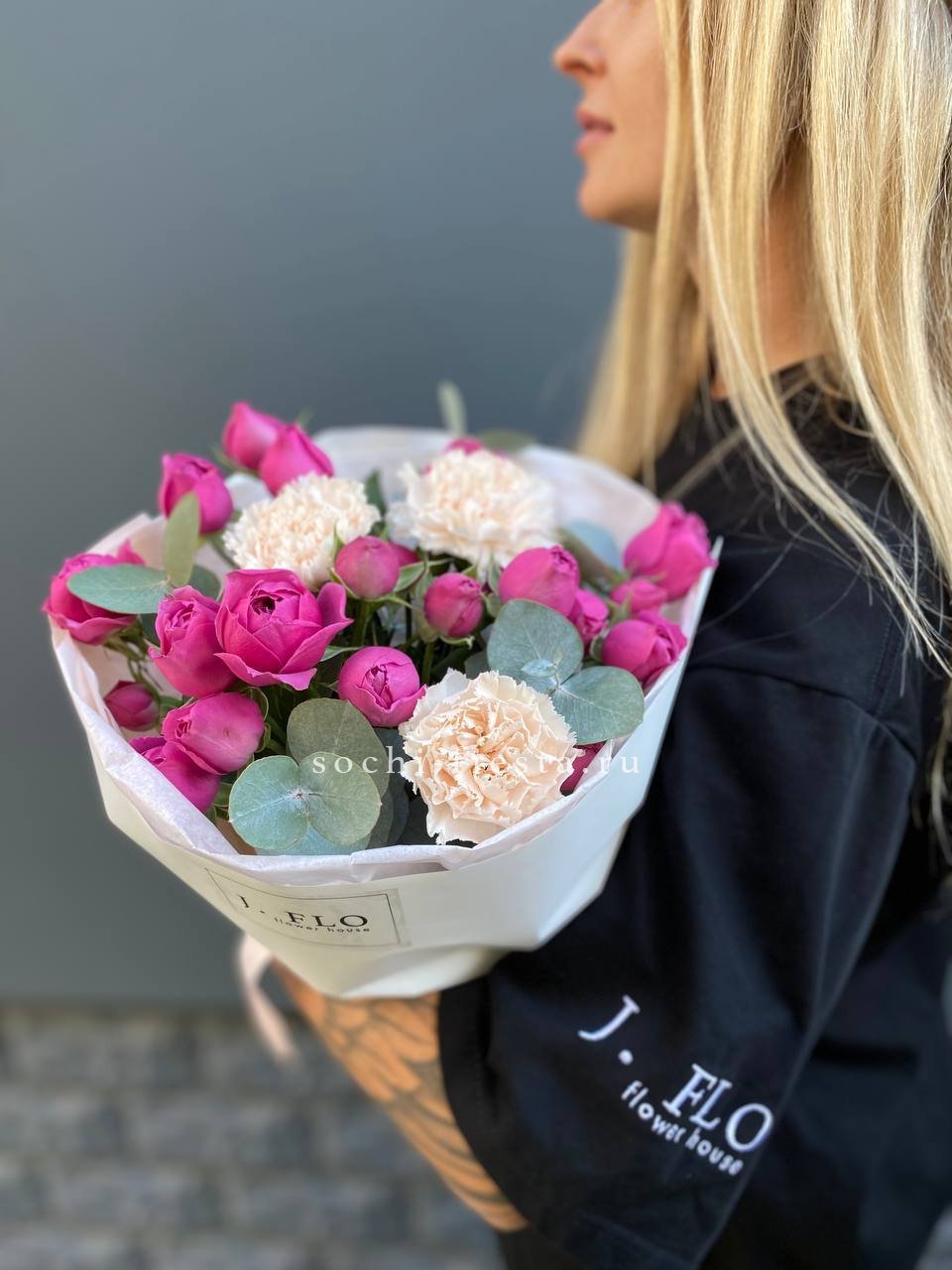 композиция с применением одноголовой розы, гвоздики и других цветов, упаковка, лента.