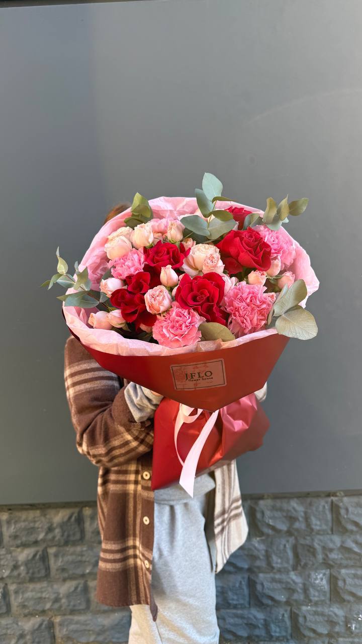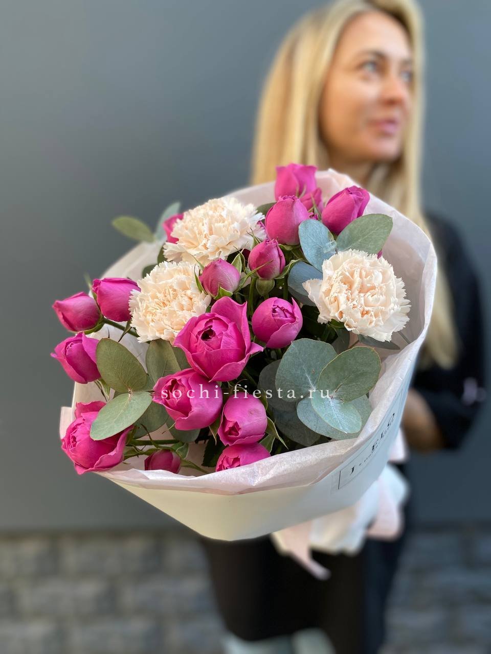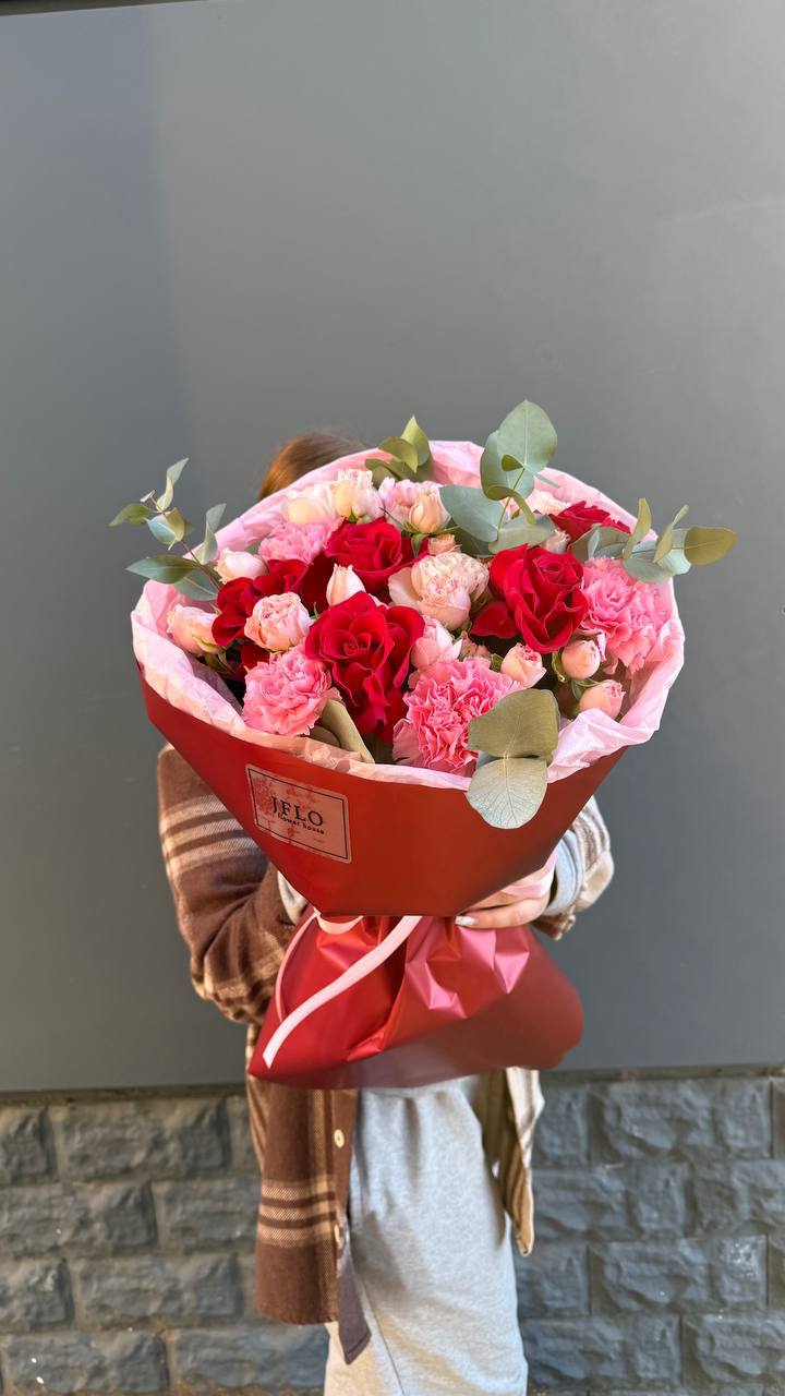 Компактная композиция с четким ритмом бутонов и легкой подачей. Гвоздики и розы собраны в аккуратную форму, удобную для размещения в любом пространстве.